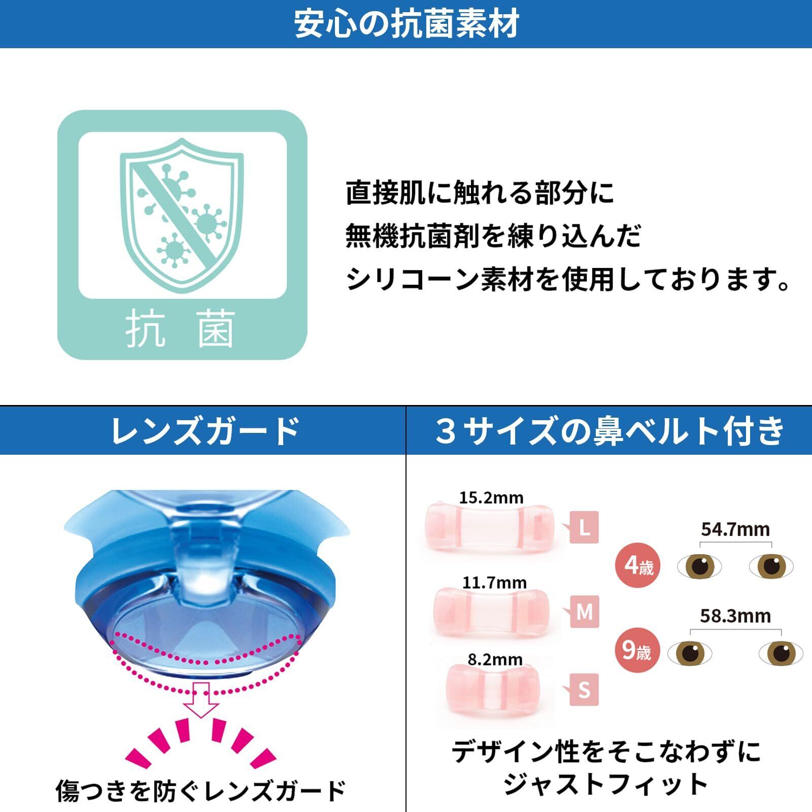 【3サイズの鼻ベルト付き】 子供の成長は著しいものですよね。VIEWのゴーグルには3サイズの鼻ベルトがついていますので、お子さまの成長に合わせて鼻ベルトを替えていただくことで、快適に長くお使いいただくことが可能です。装着時に目と目の間がきつそうに見えたり、お子さまが圧迫感を感じる場合にはサイズアップ。逆に視界の邪魔になったり水の侵入があるような場合はサイズダウンしてお使いください。是非、ストラップ(ベルト)調整だけでなく鼻ベルトも付け替えて快適なスイミングをお楽しみください。