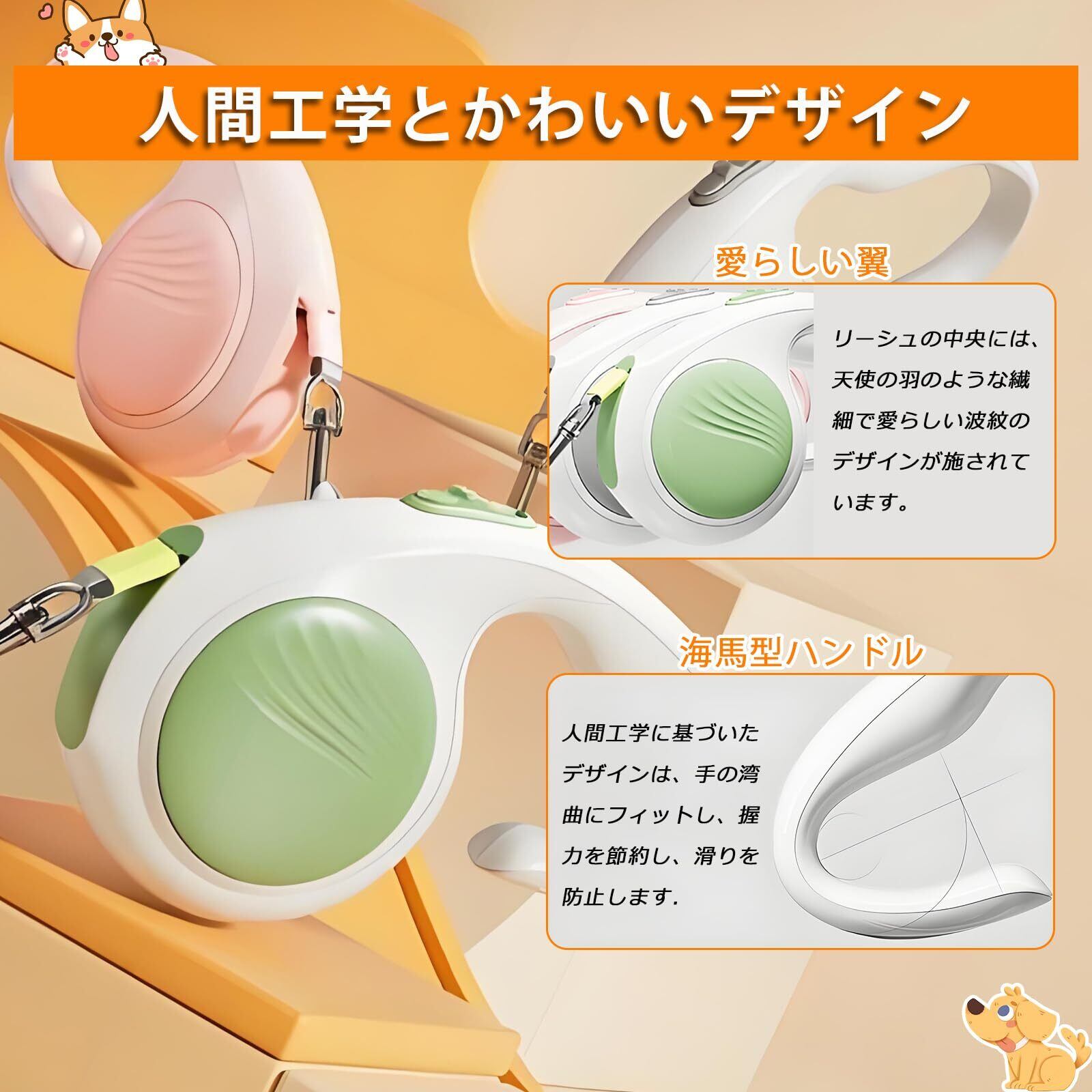 【人間工学とかわいいデザイン】:リーシュの海馬型ハンドルは手のひらのカーブにフィットするように設計されており、握力を節約し、滑りを防止します;この犬用リードの中央には天使の羽のような波紋のデザインが施され、繊細で愛らしい。本体全体はわずか210gで、長時間のペットの散歩でも手首に負担がかかりません。