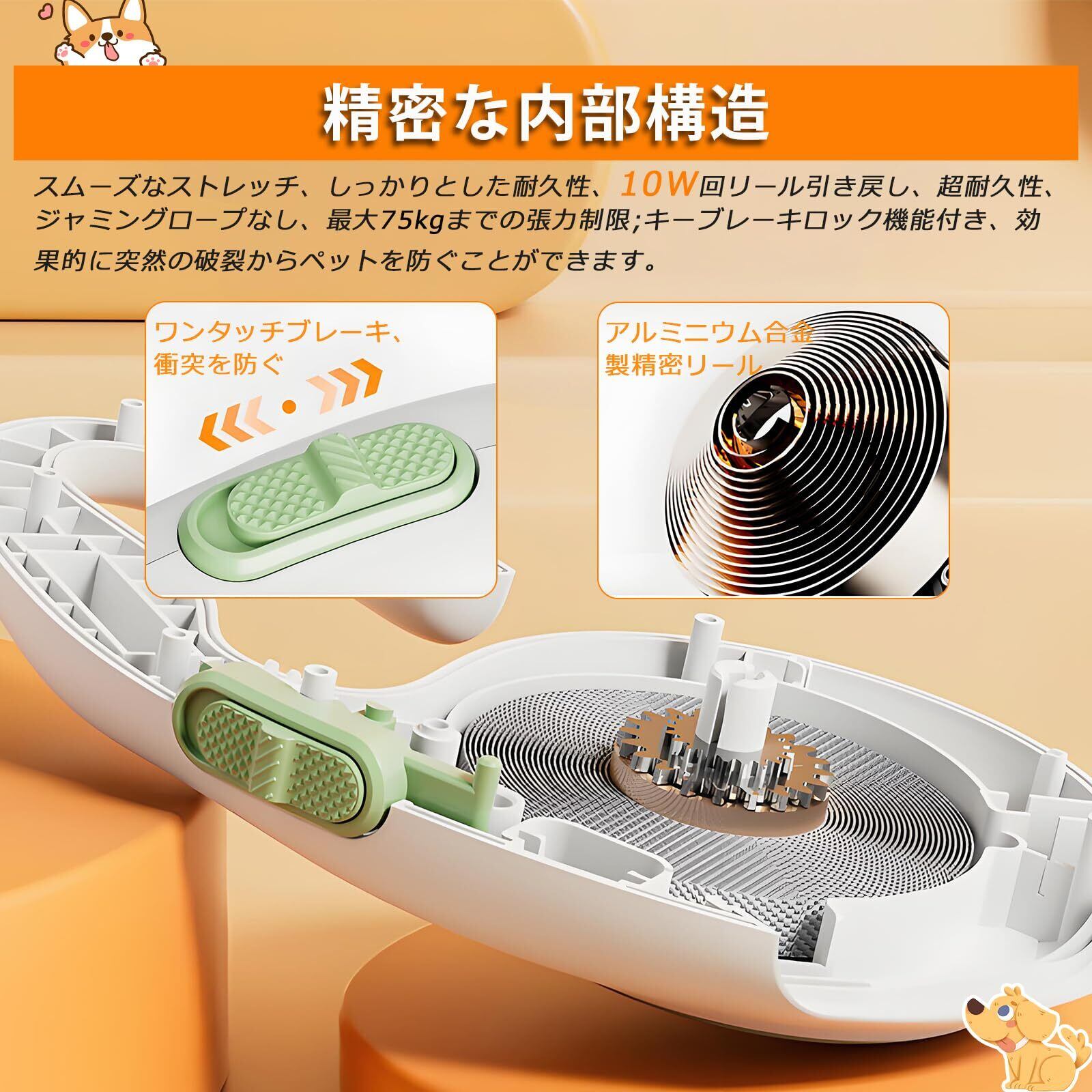 【ワンキーブレーキ、強力な引き込み】:この犬用リードはアルミ合金の精密なリールの動きを採用し、強力な引き込み力とスムーズな反発体験を提供し、ワンキーブレーキロック機能付き、ペットの突然の破裂を効果的に防止します。