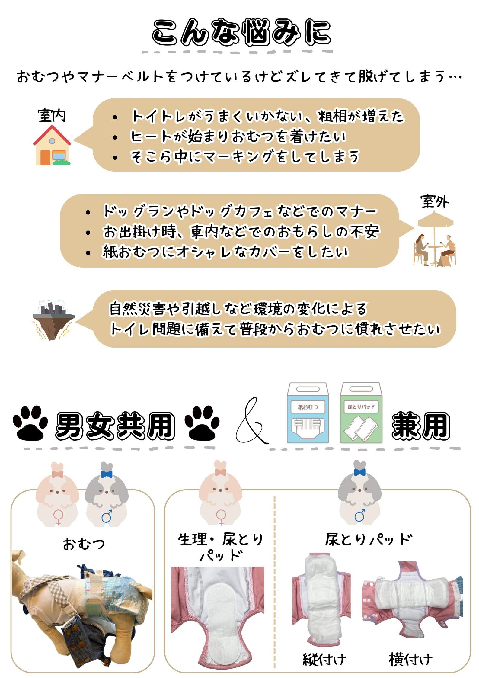 可愛い愛犬との生活。トイレ問題でストレスになっていませんか? おもらしやマーキングで困っている、ヒート中や介護中でおむつや尿パッドを使用しているけど脱げてしまう。 ドッグラン や、ドッグカフェ 、愛犬とのお出かけにマナーとしておしゃれなオムツカバー が欲しい。 そんな悩みに[脱げにくい機能性]と[見た目の可愛さ]を叶えるおむつカバーです。男女兼用でおむつにも、尿パッドにも使用可能です。
