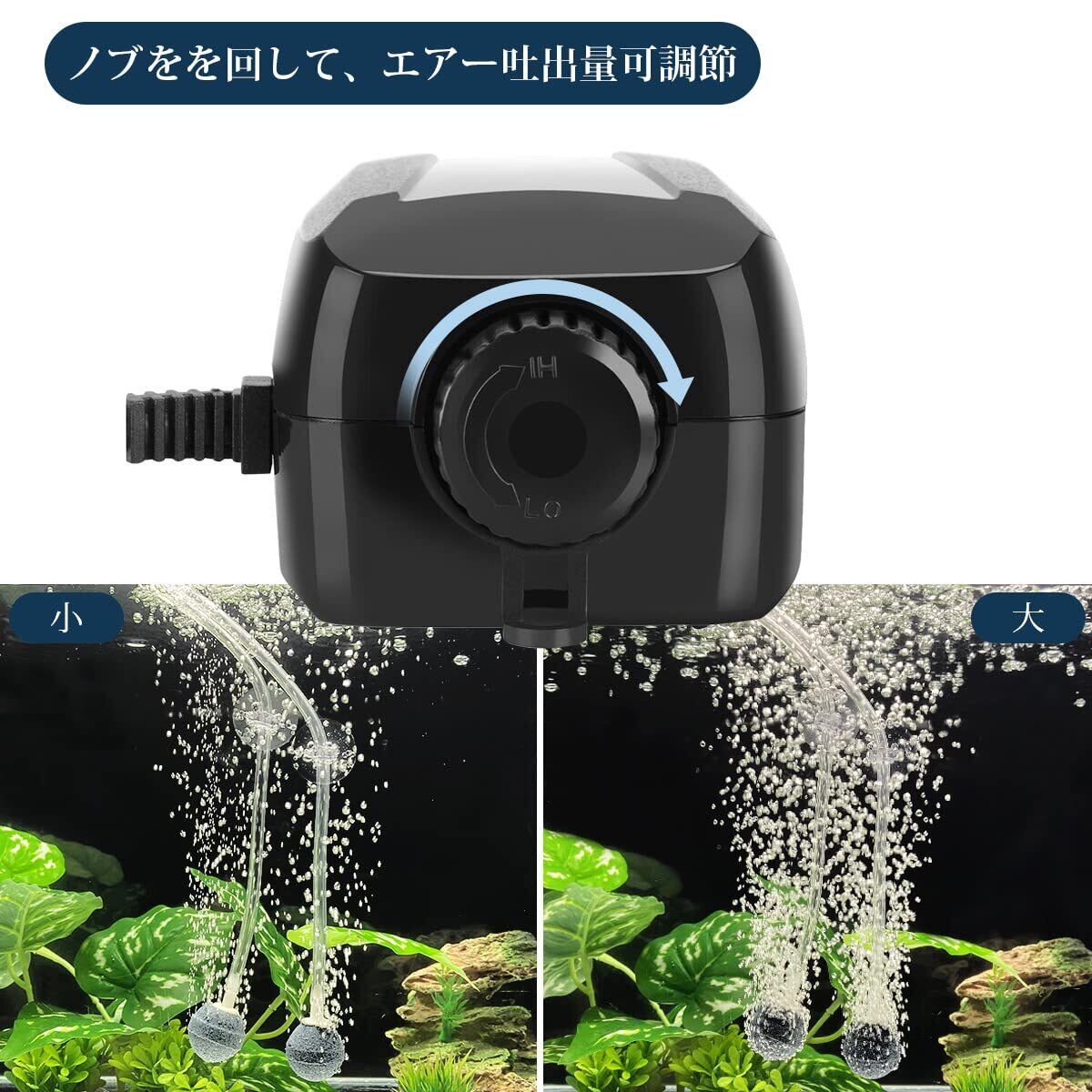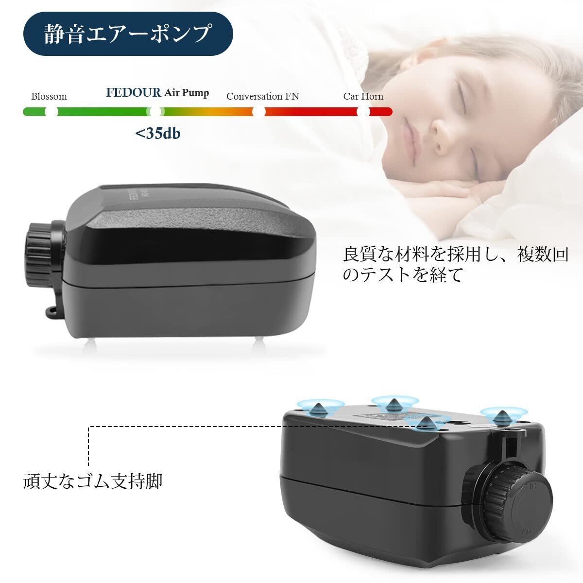 「静音性能」:厚いプラスチックケースによって防音性が高く、まだ振動吸収脚ゴムによって周囲へ振動を伝えないことにより、このエアポンプが超静音です。