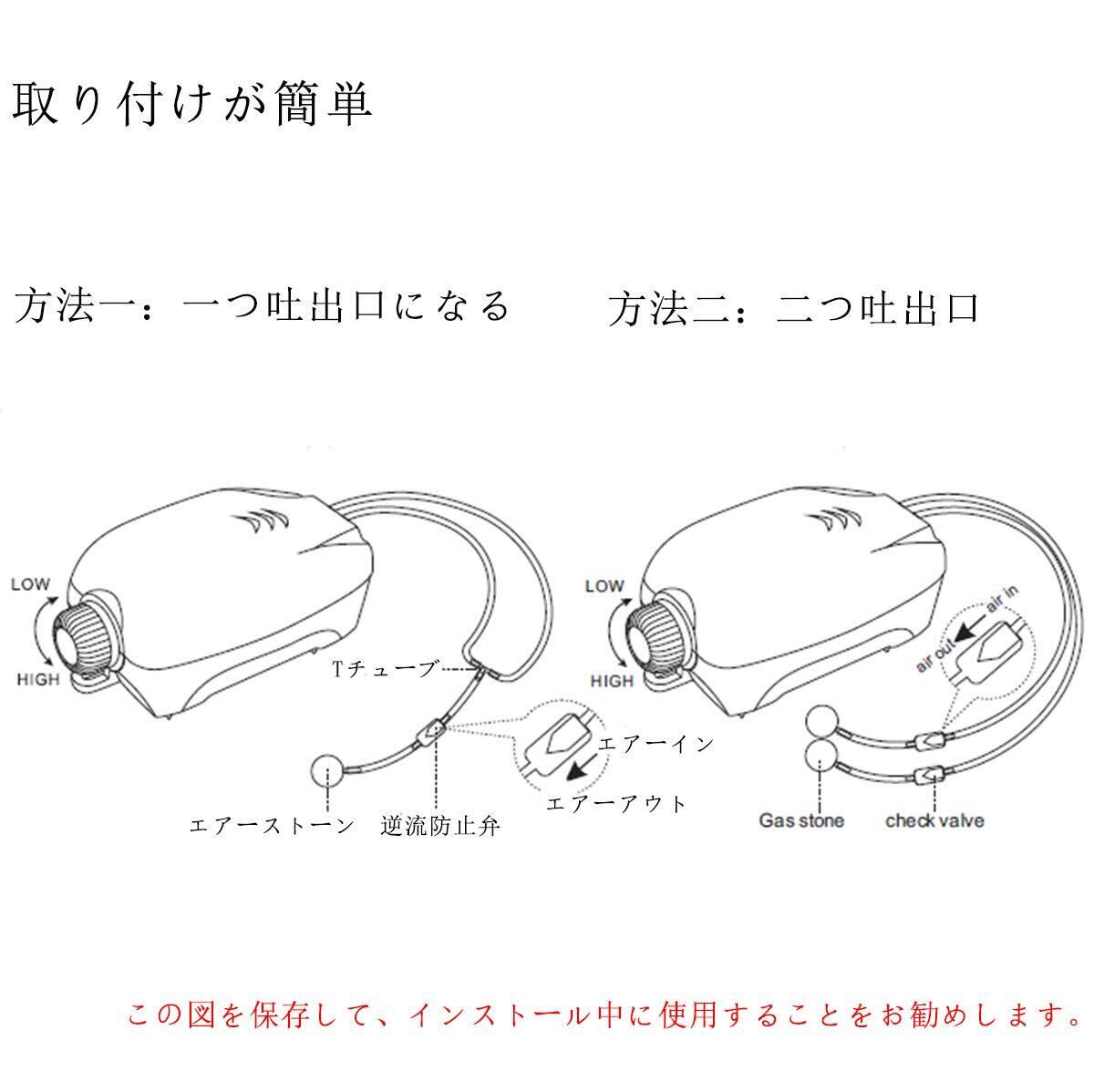 「エアー吐出量可調節」ダイヤルを簡単に回転して、エアー吐出量を調節できます。それ以外、2つエアー量調節弁の付属品があり、もっと自由にこのエアーポンプをご使用できます。