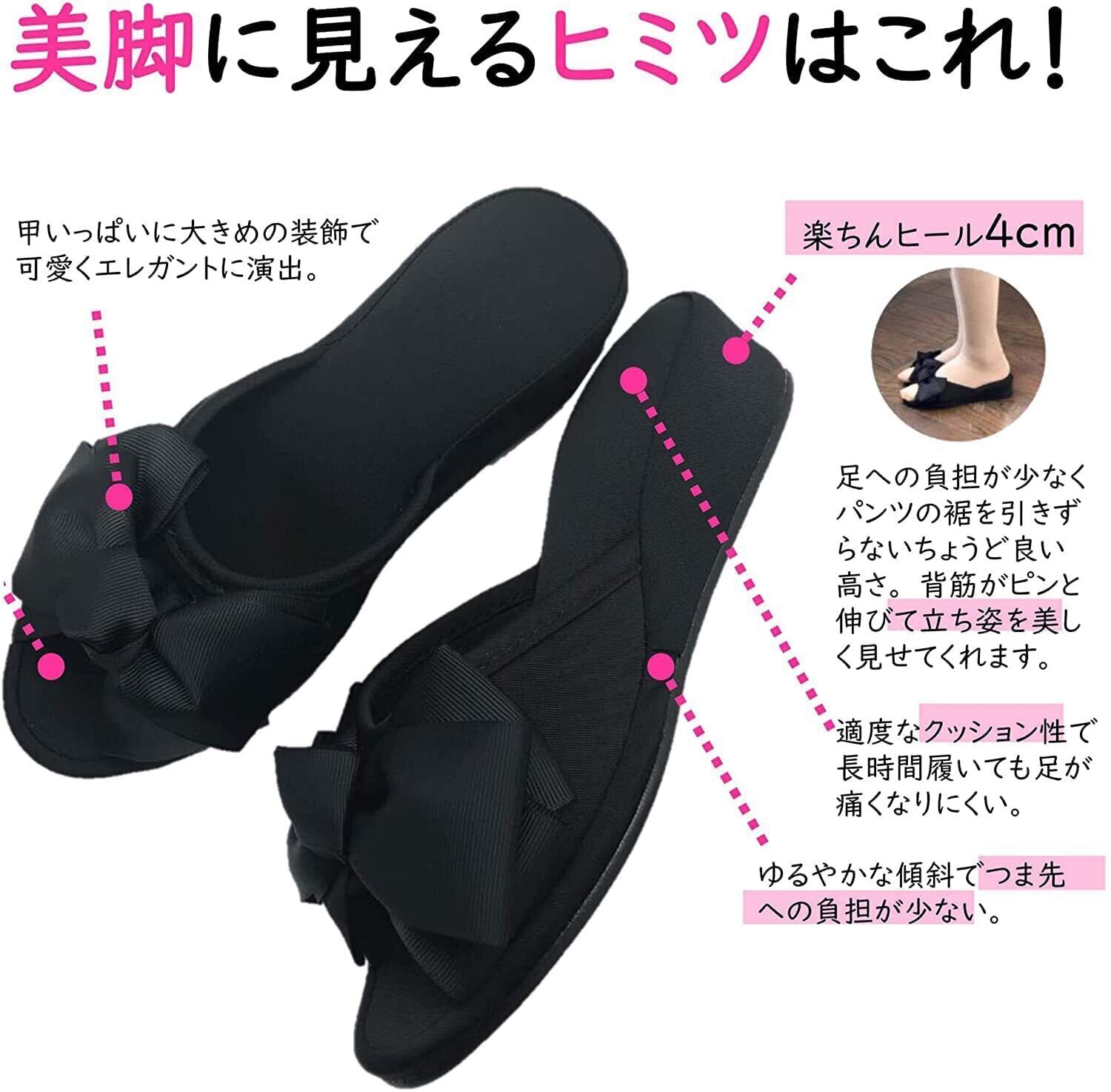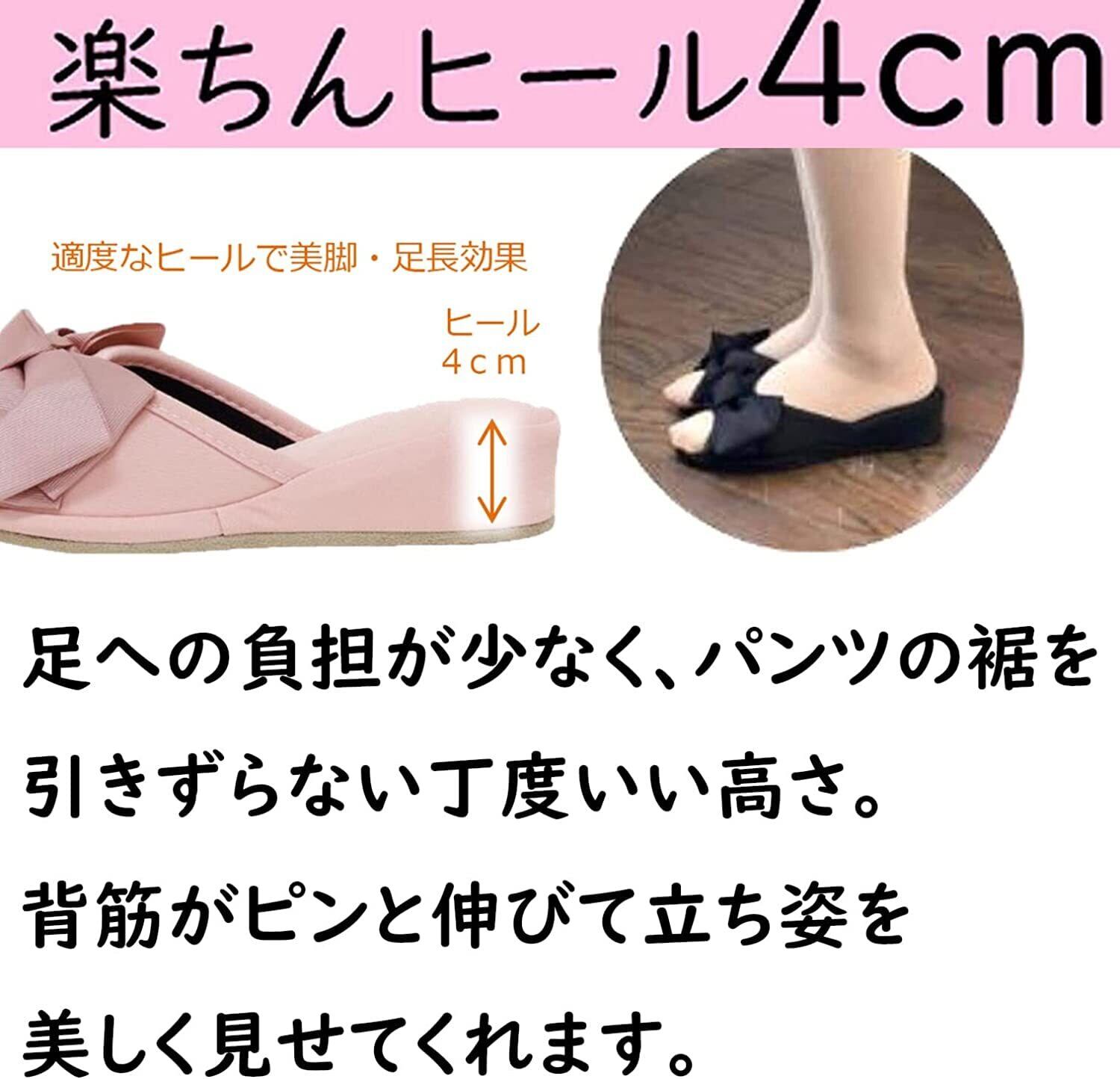 いつものスリッパをぐっとおしゃれに。楽ちんヒールで楽ちん美脚&脚長効果。4cmヒールで立ち姿をより美しく、疲れにくく設計しています。軽量でソールは静音仕様。室内で安心して使えます。