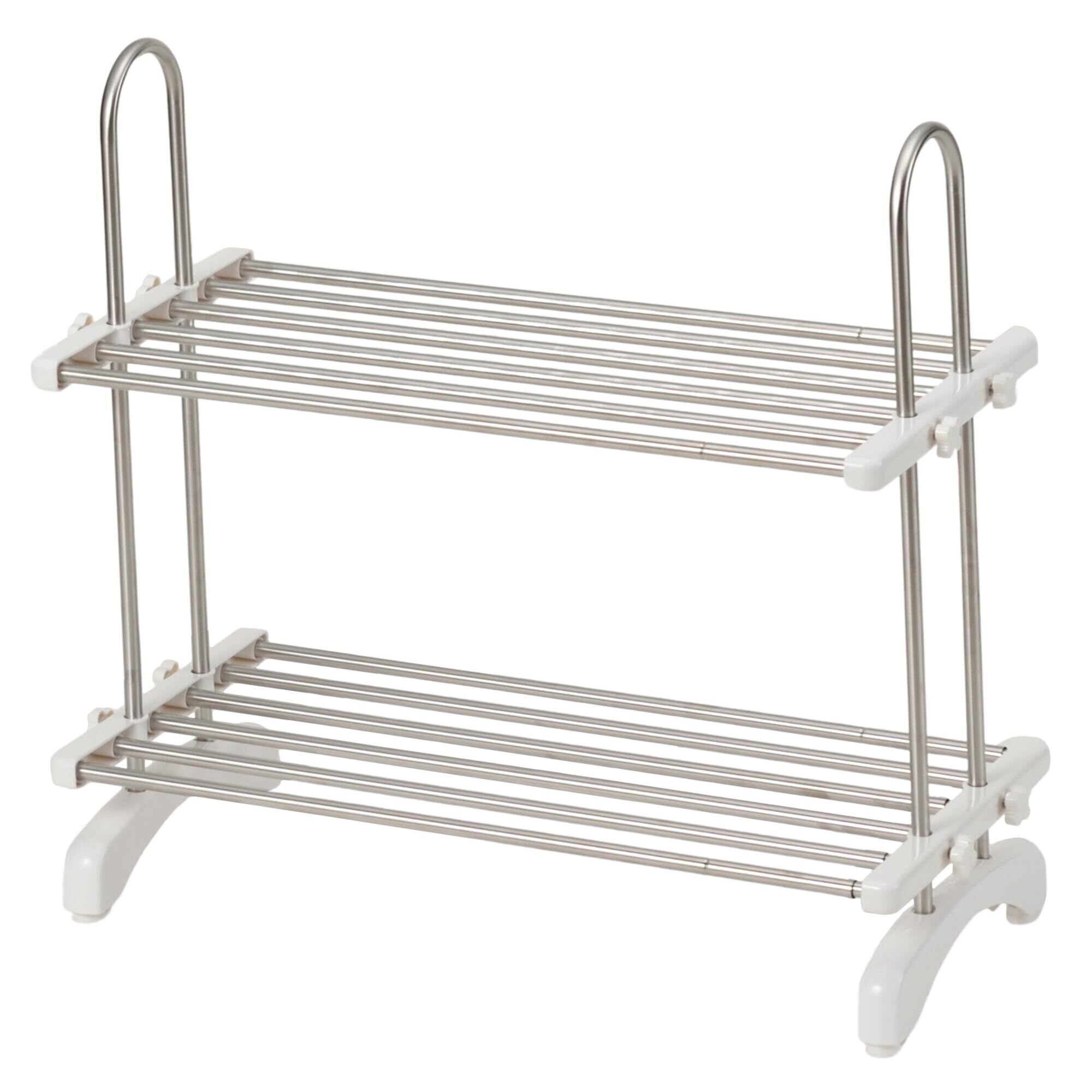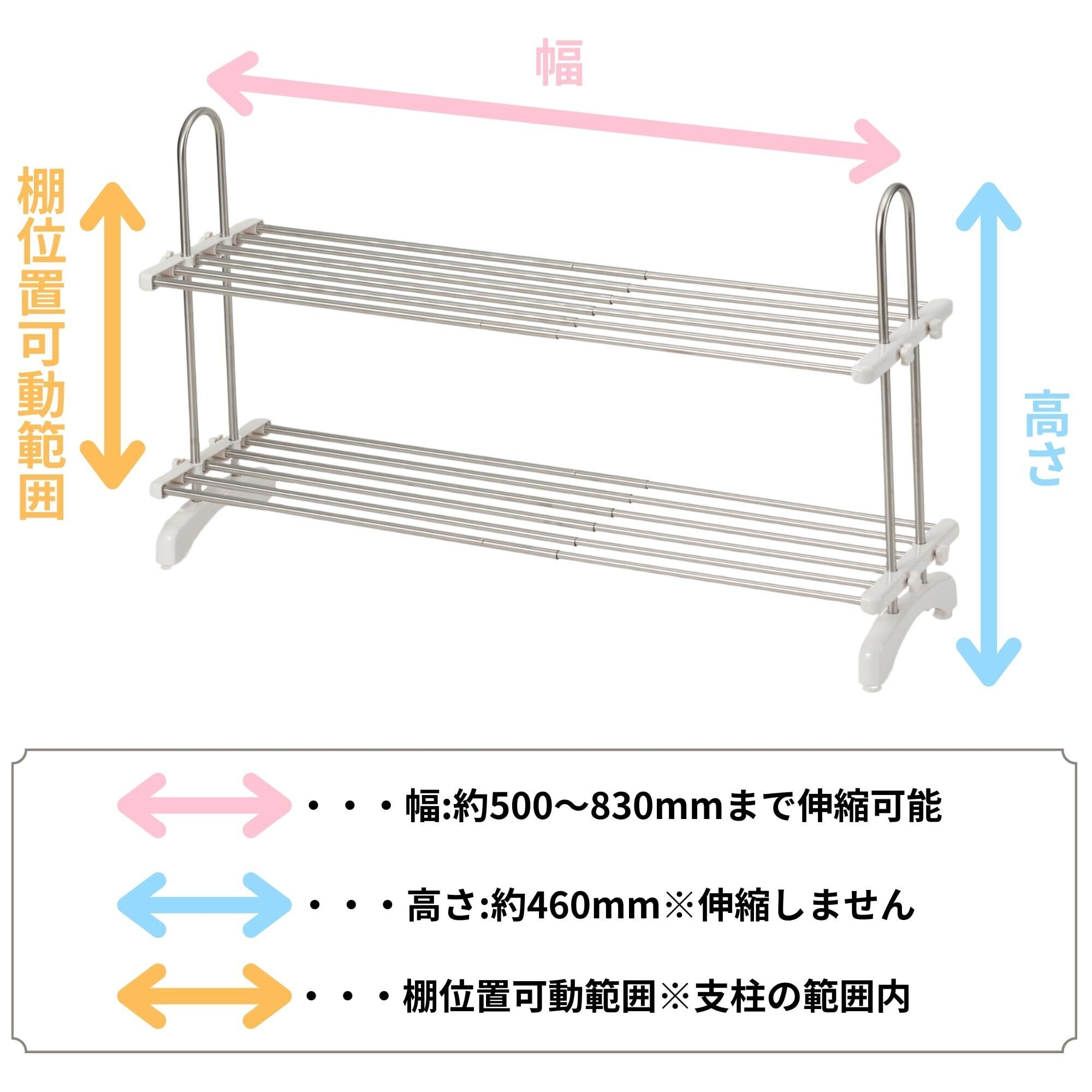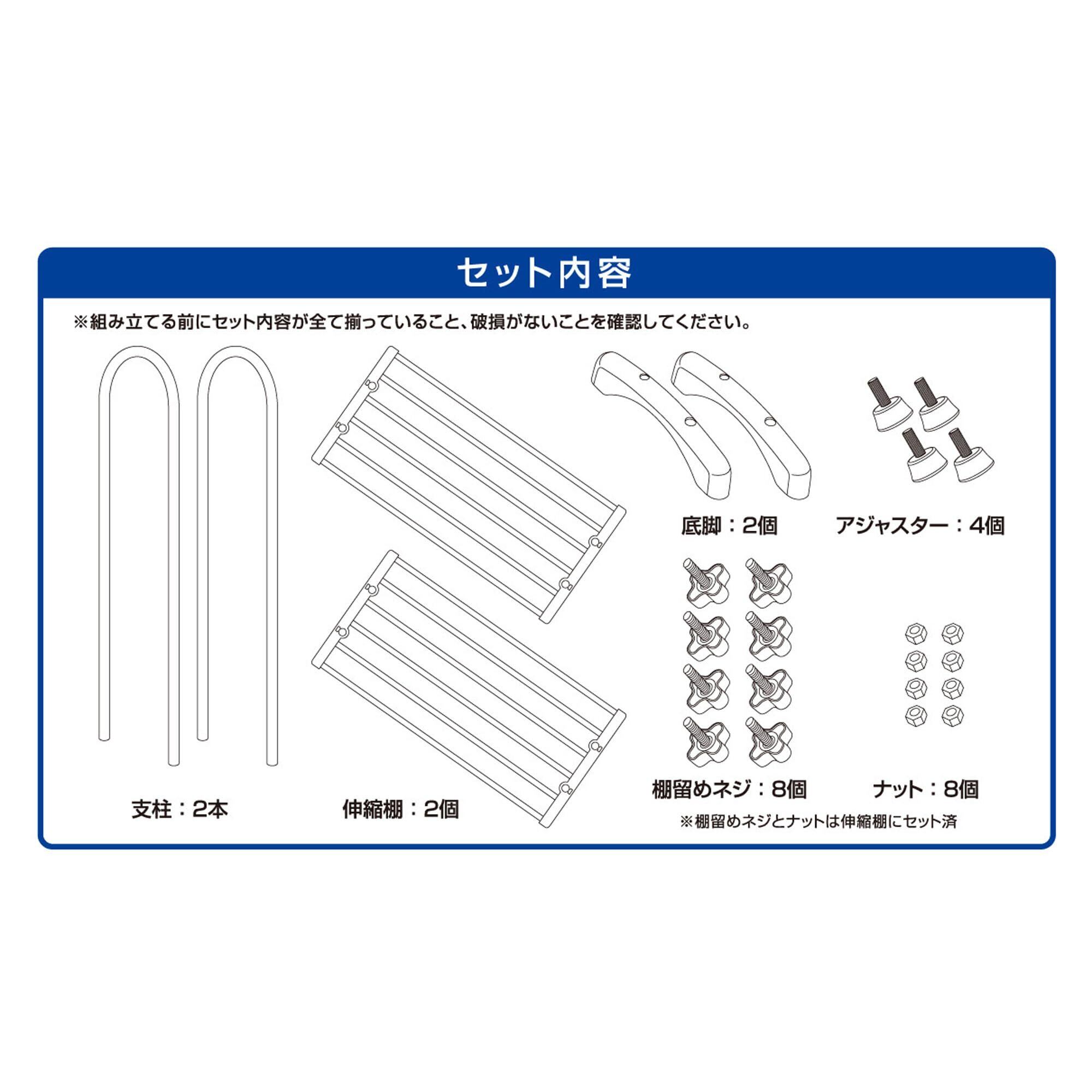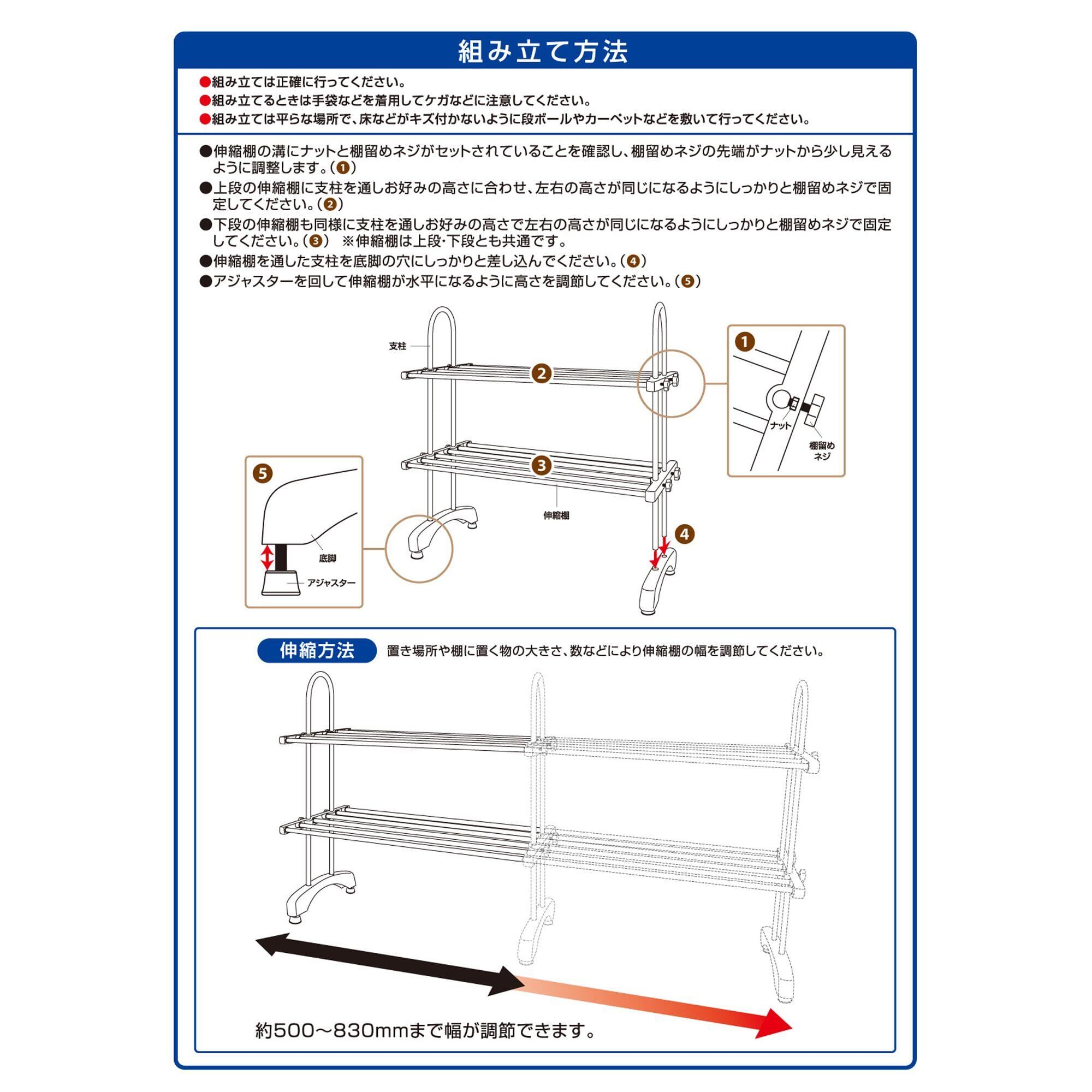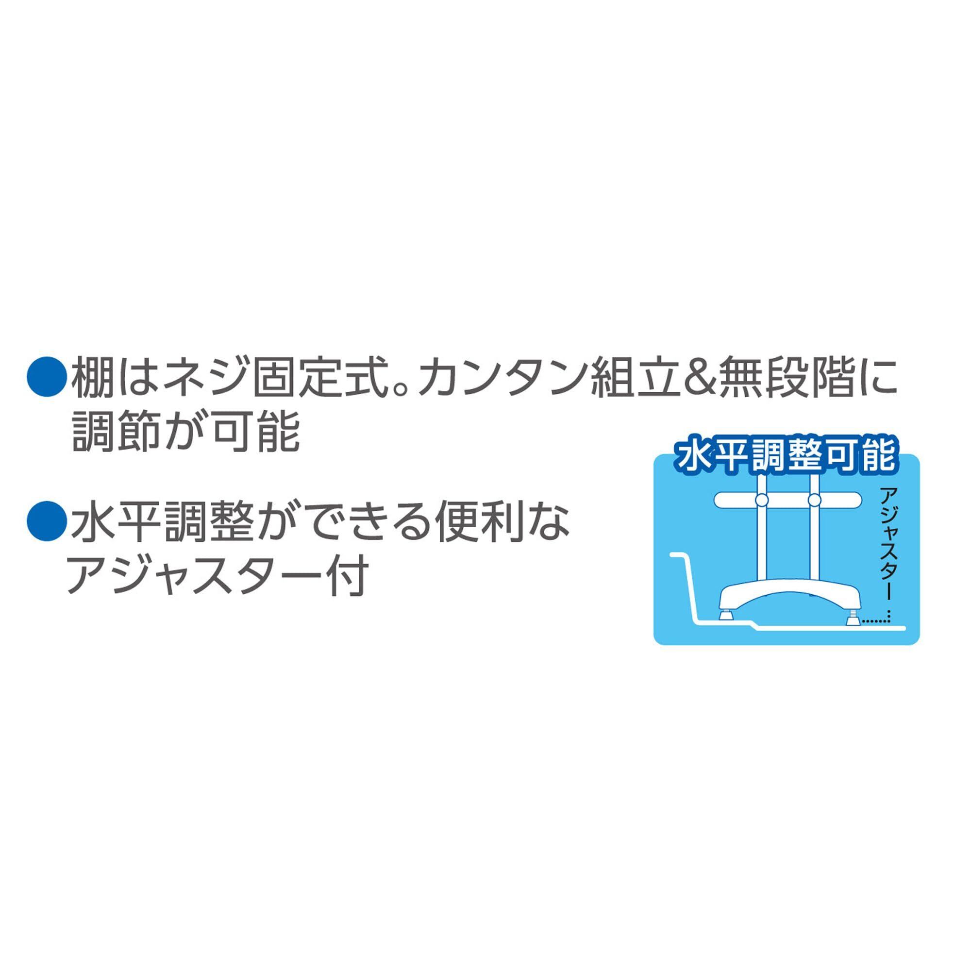 [材質]支柱:ステンレス/伸縮棚:ステンレス・ABS樹脂(耐熱温度80度)/棚留めネジ:鉄・ABS樹脂(耐熱温度80度)/アジャスター:鉄・ABS樹脂(耐熱温度80度)/底脚:ABS樹脂(耐熱温度80度)