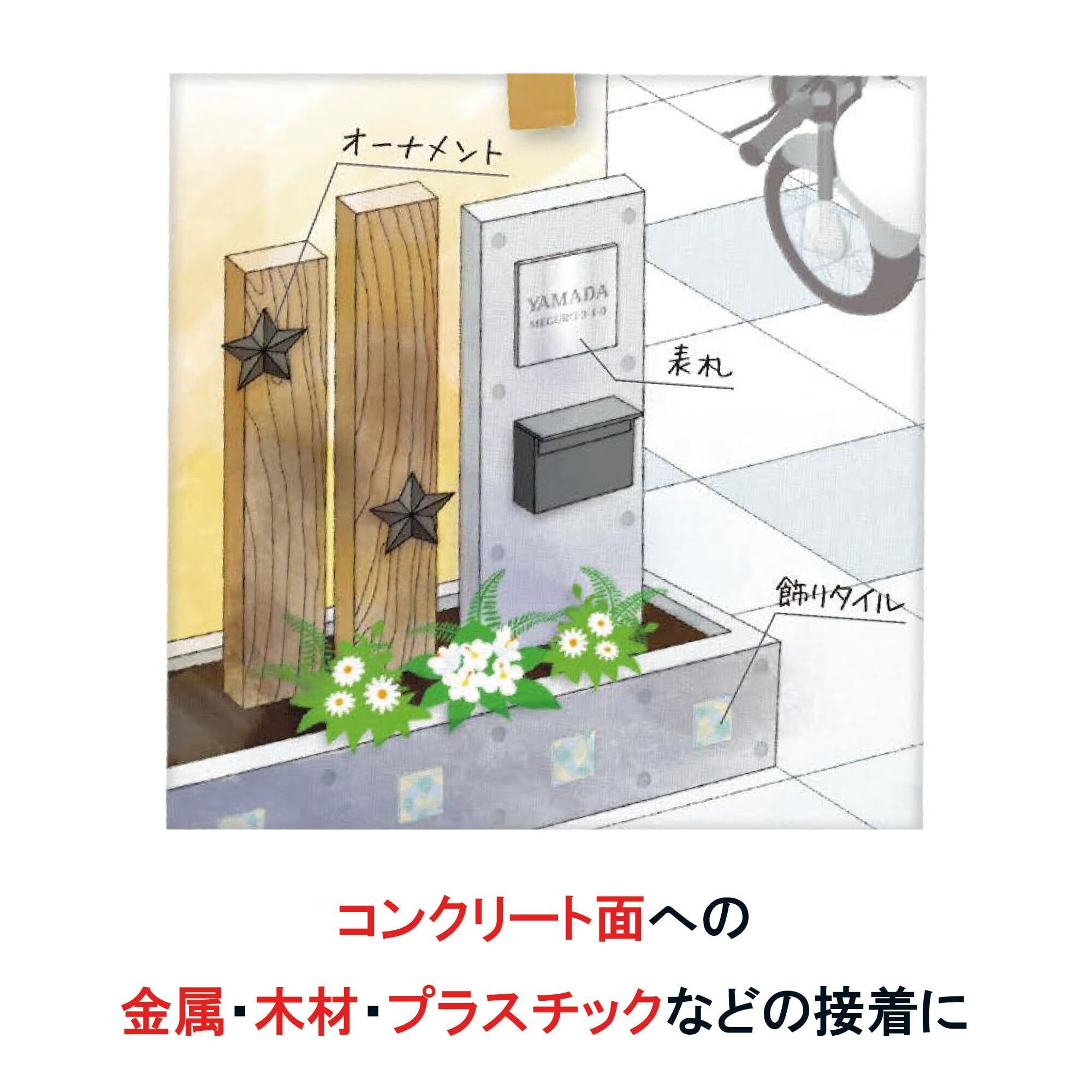 コンクリート、モルタル面に木材、タイル、プラスチック、各種金属類を強力接着