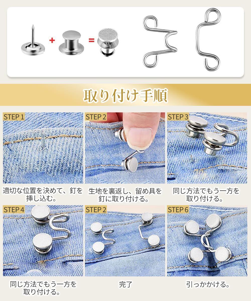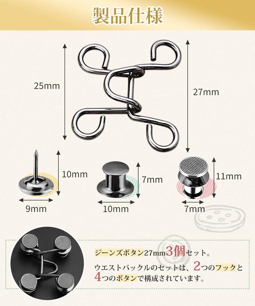 【パッケージ内容】ジーンズボタン27mm3個セット。ウエストバックルのセットは、2つのフックと4つのボタンで構成されています。