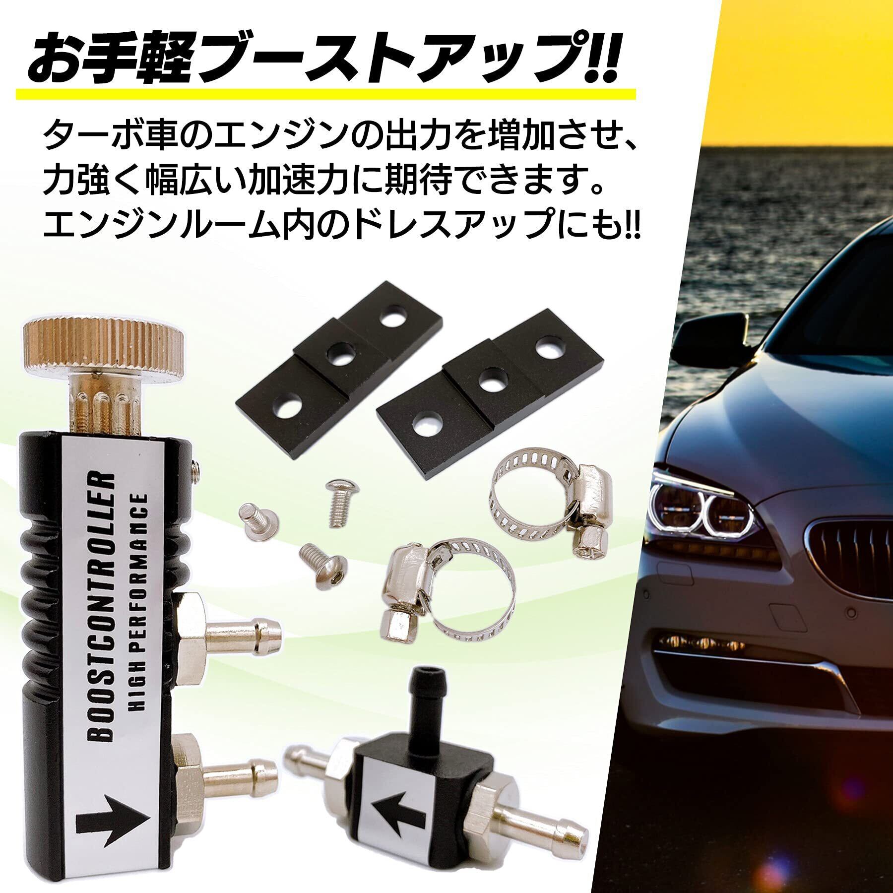 簡易的でお手軽にブースト圧を上げてパワーアップさせる為のアイテムです。 ブーストゲイン/燃調等のセッティングはこの装置で調整できませんのでご注意下さい。 ※ブースト圧の上げ過ぎは故障の原因となりますので、ブースト圧計との併用をオススメいたします。