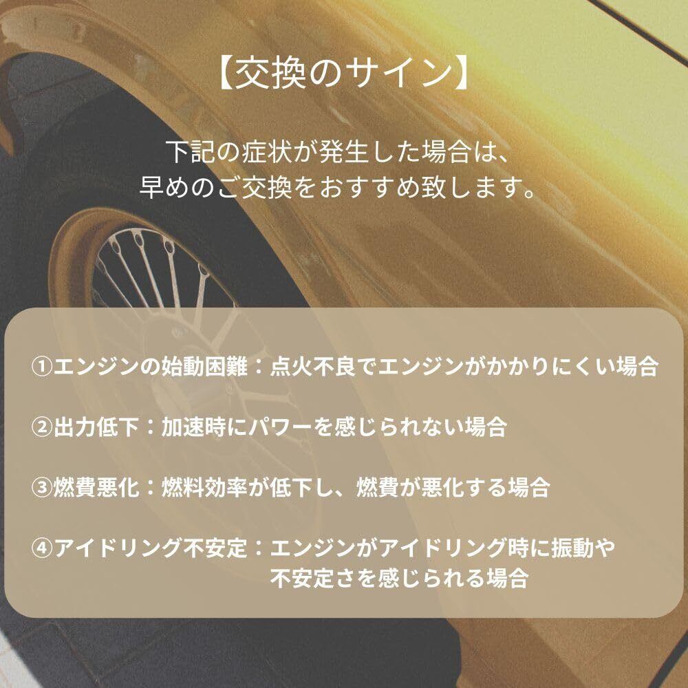 【交換のサイン】①エンジンの始動困難:点火不良でエンジンがかかりにくい場合。②出力低下:加速時にパワーを感じられない場合。③燃費悪化:燃料効率が低下し、燃費が悪化する場合。④アイドリング不安定:エンジンがアイドリング時に振動や不安定さを感じられる場合。このような症状が発生した場合は、早めのご交換をおすすめ致します。