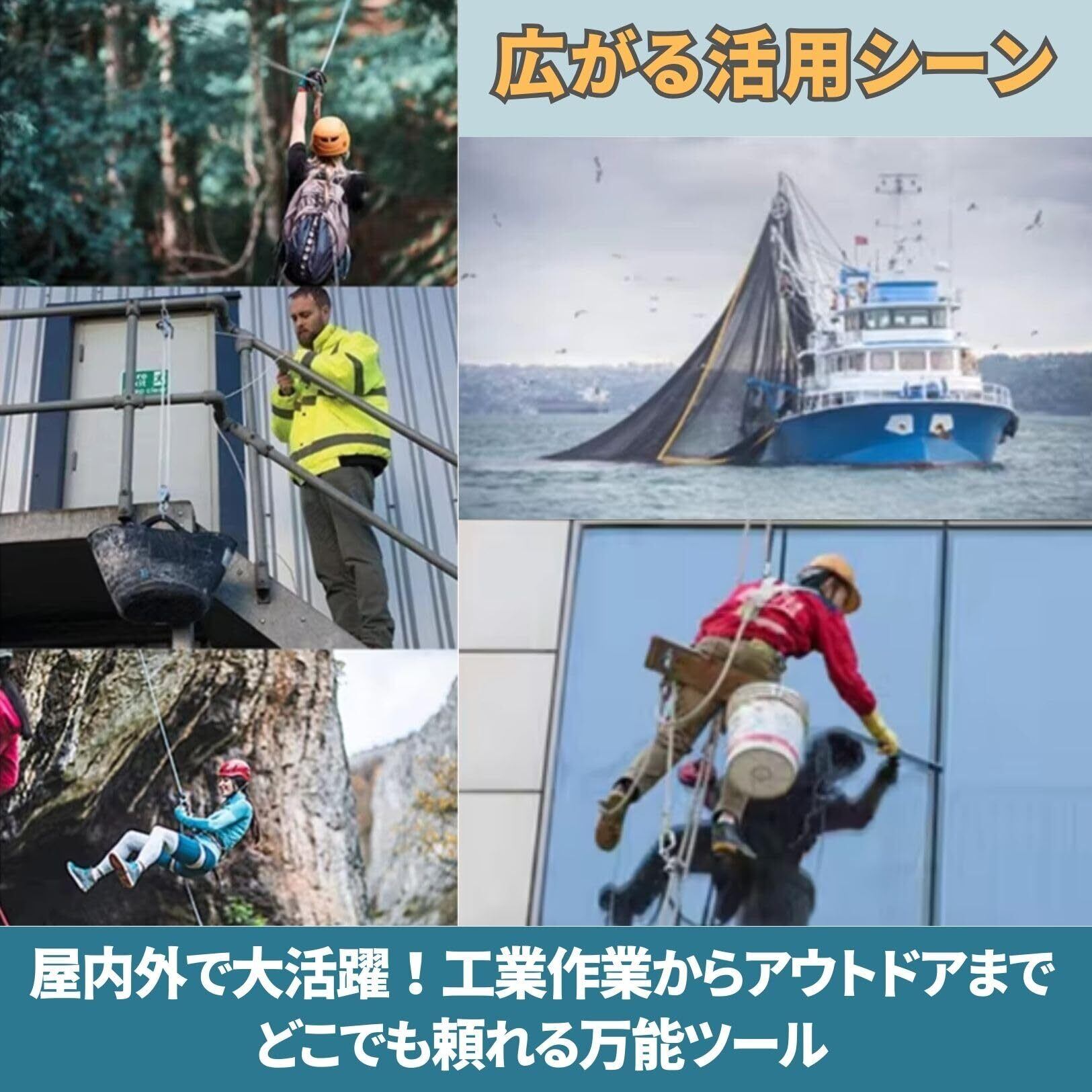 【幅広い用途で活躍】 工業用の持ち上げ作業や貨物輸送から、ロッククライミングやDIY作業まで、さまざまなシーンで活躍します。屋内外を問わず、多様なロープツールと組み合わせて使えるため、家庭や職場での用途は無限大。柔軟性の高い設計が特徴です。
