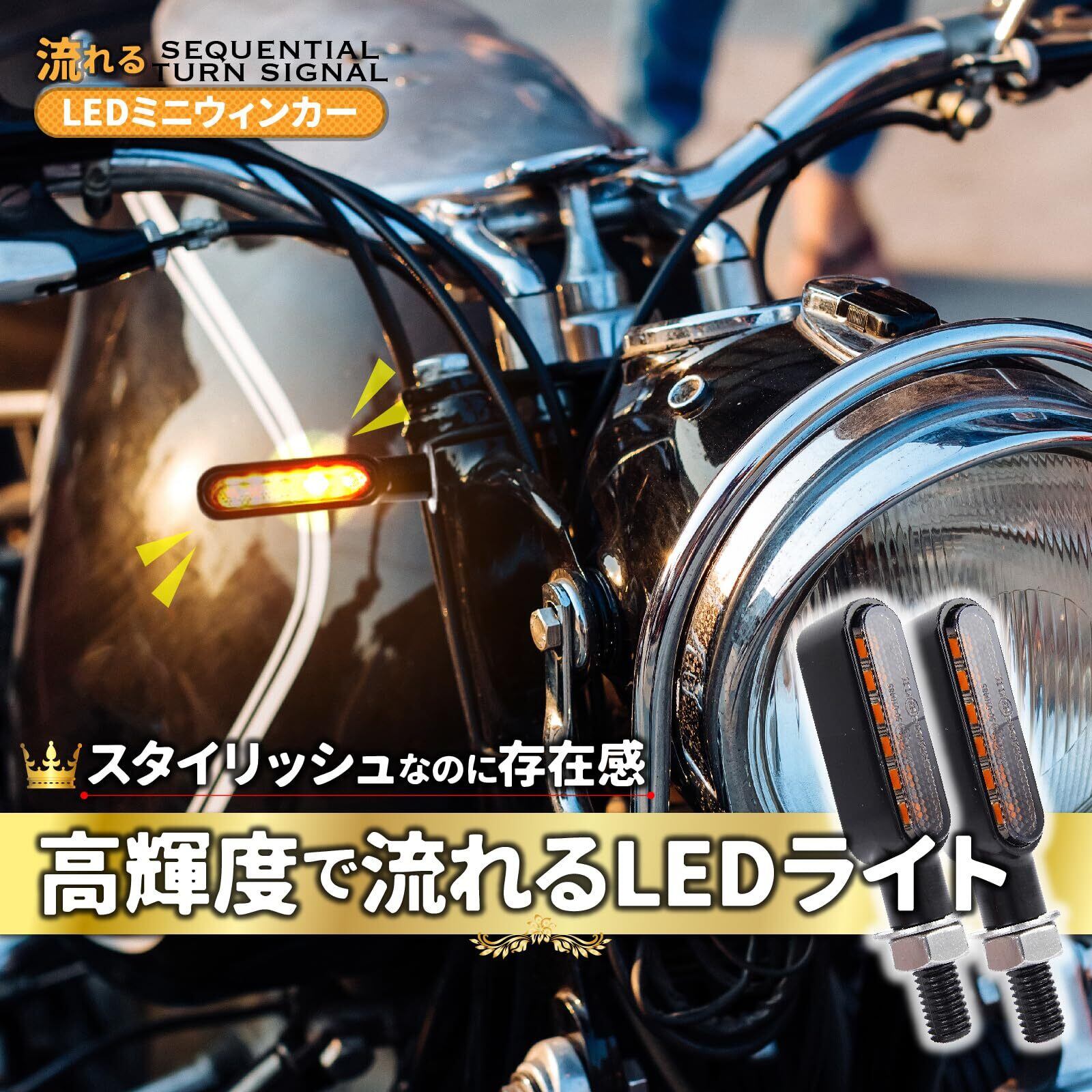 バイク用ウインカーは、バイク専用の高輝度LEDで流れるライトがかっこいいシーケンシャルウィンカー。バイクのカスタム、ドレスアップに最適。小型、汎用性が高い12V、IP67防水で雨の日の運転にも。Eマーク認証付きで車検も対応。2個、4個セット。
