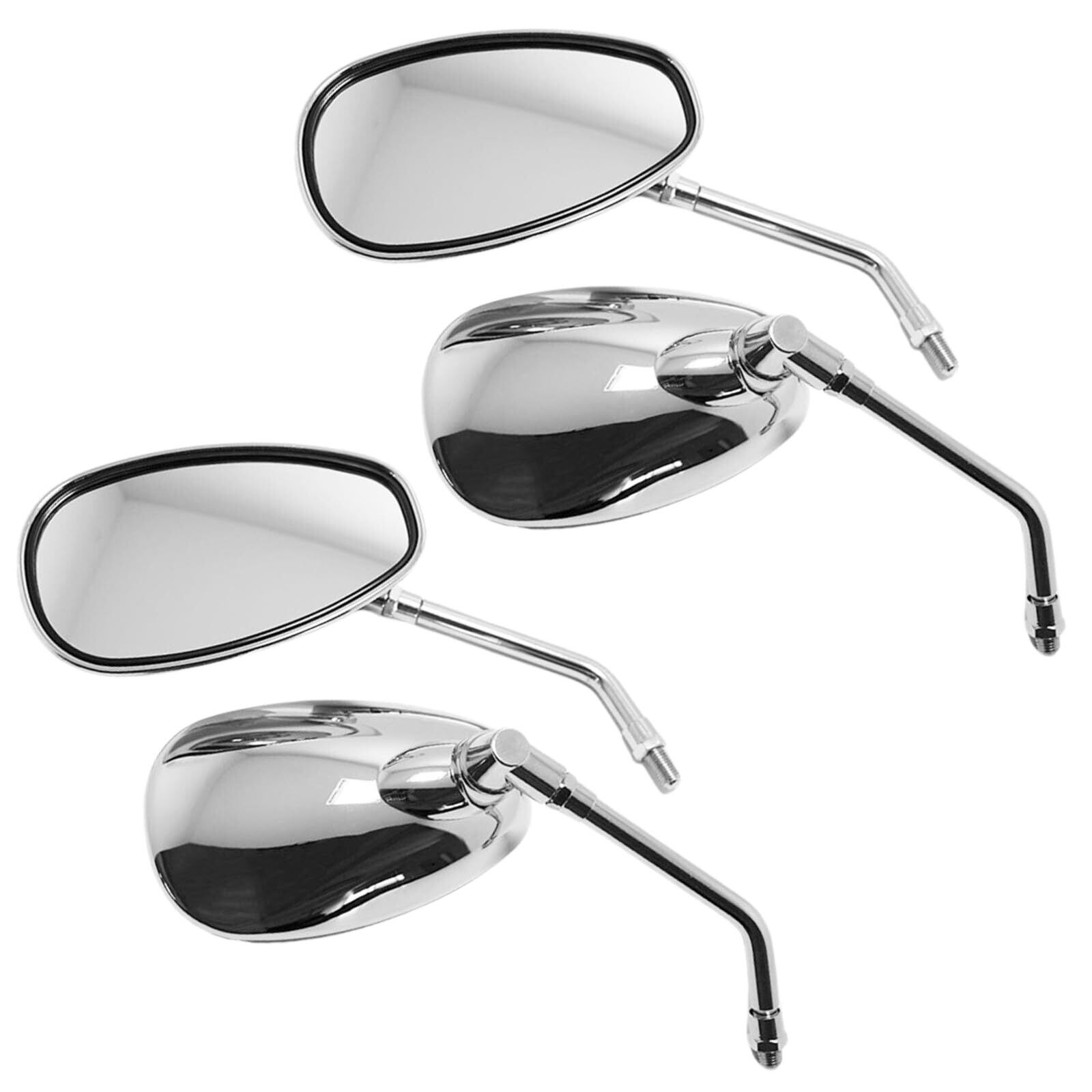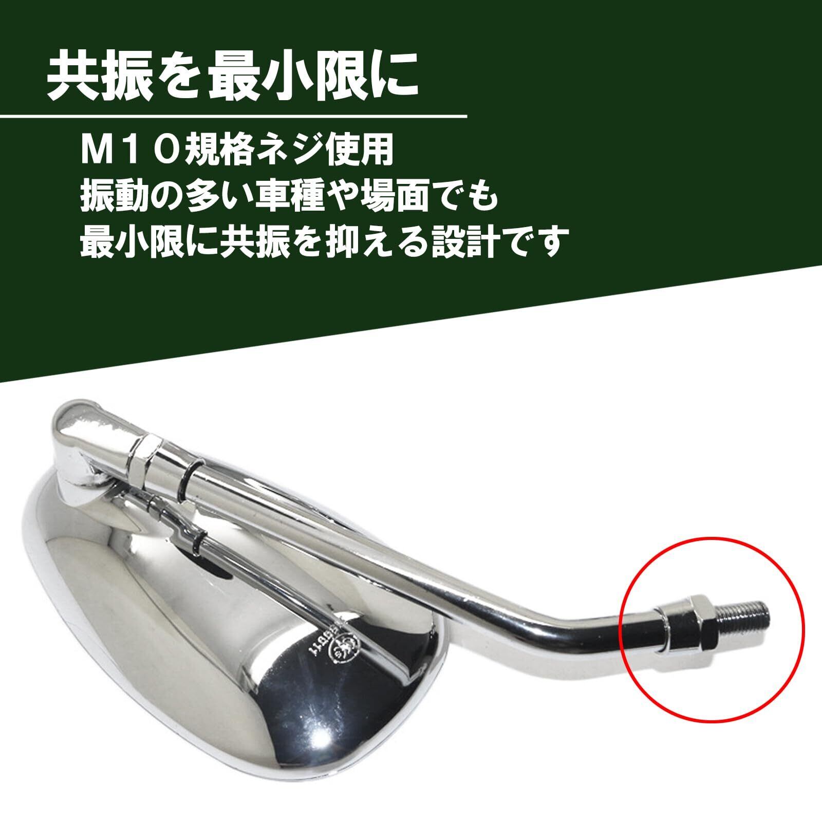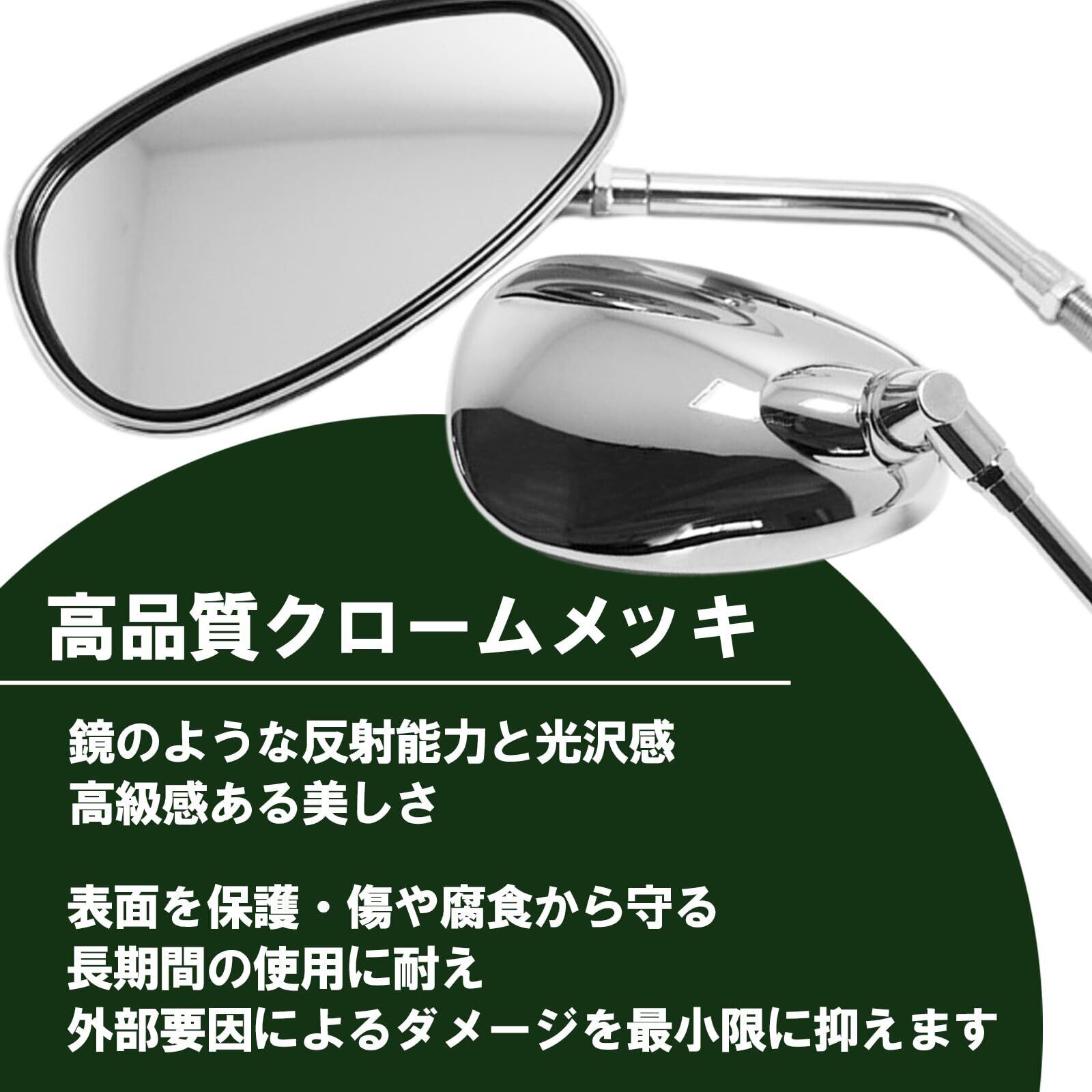 【サイズ】ミラー部分(1番長い部分):縦9cm×横15cm、【ネジ規格】M10正ネジ(10mm)、【重量】約510g/個、【素材】クロームメッキ、【バリエーション】左右2個セットと左右2個セット×2(合計4個)の2種類よりお選びいただけます。