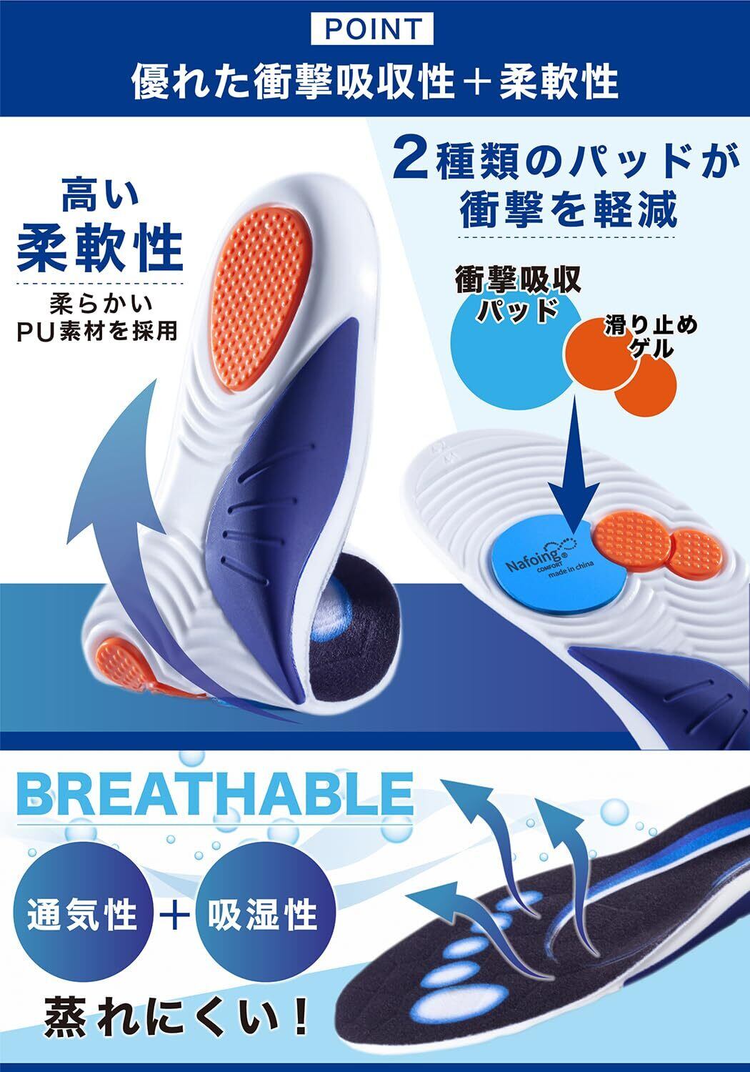 【衝撃吸収】毎日の歩行をもっと快適に。ポリウレタン素材のクッションが、衝撃を吸収し、足を守ります。