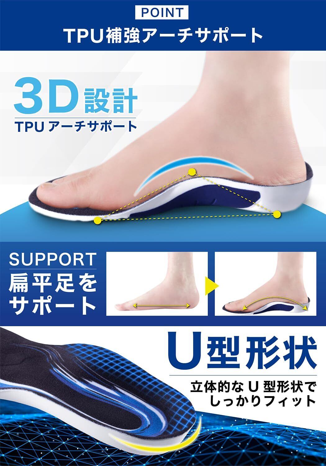 【足裏のアーチをサポート】土踏まずにフィットし、足裏のアーチを支えることで快適な歩行をアシスト。