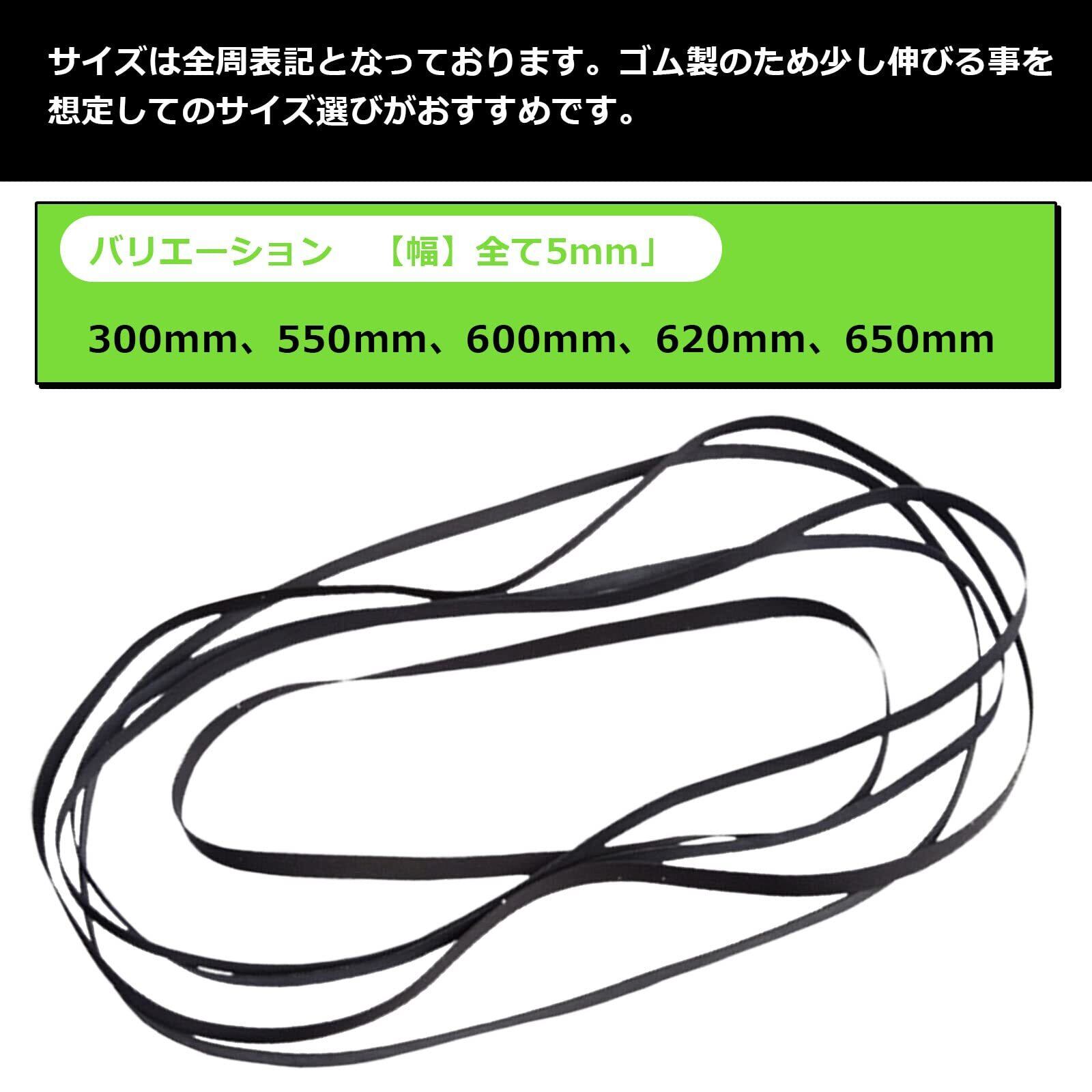 【バリエーション】300mm、550mm、600mm、620mm、650mm(幅:全て5mm)。サイズは全周表記のため、ゴムの伸縮を考慮したサイズ選びが重要です。経年劣化により音楽を楽しめなくなったプレイヤーも、ベルト交換で復活する可能性があります。
