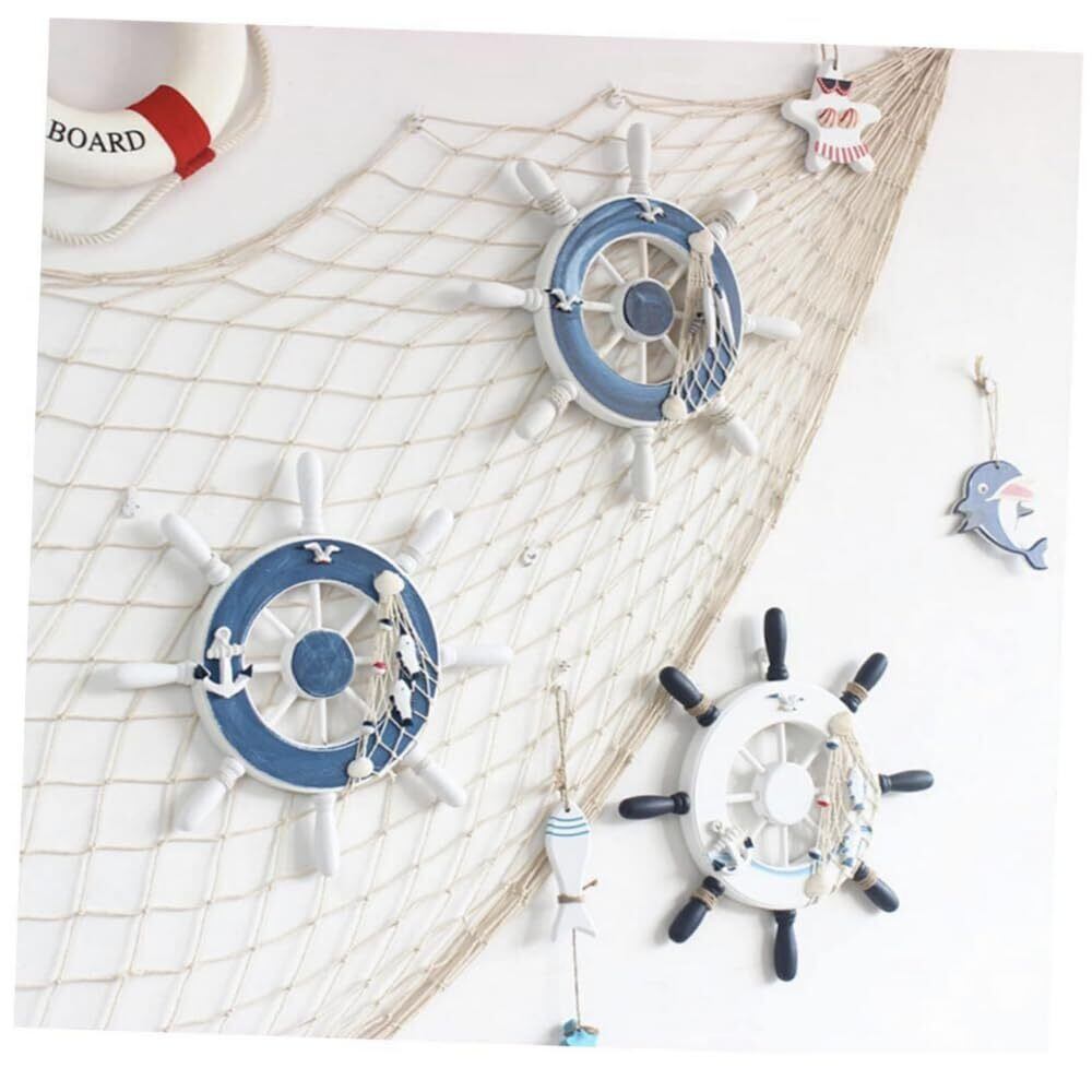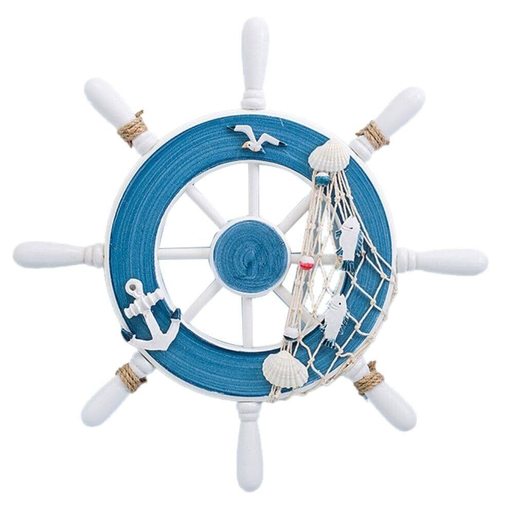 【海の風景、あなたの部屋へ。マリンテイストの魅力を味わう、ブルーベースの舵輪ウォールデコレーション】地中海の青い海と広がる空を連想させる、素敵なブルーベースの舵舵ウォールデコレーションが登場しました。このアンティークな舵輪オーナメントは、マリンモチーフが散りばめられ、カモメが空を舞い、錨が海の底に沈む様子を美しく表現しています。