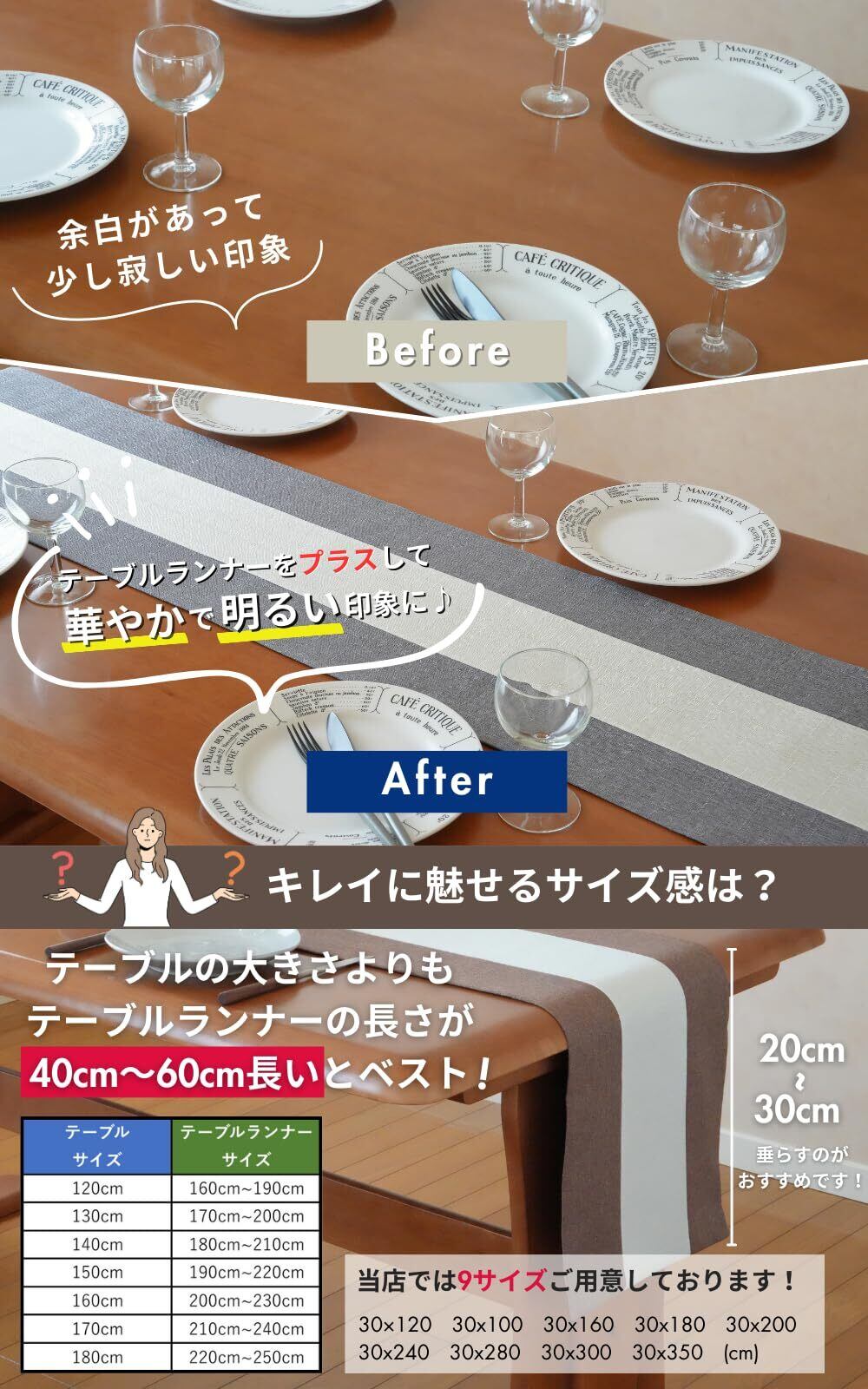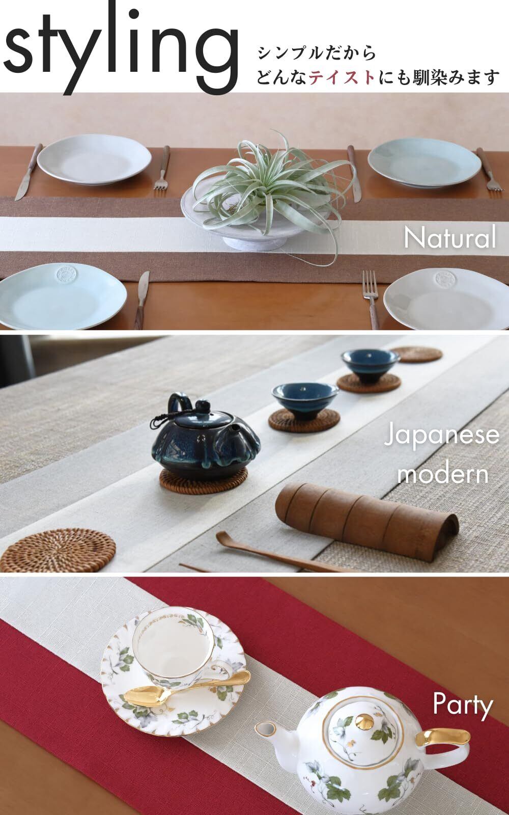 【特徴】センターに白が入ったシンプルモダンデザイン。スタイリッシュな、和モダン、ホテルライクなどお洒落な雰囲気にぴったりなテーブルランナー。やさしい手触り。柔らかく、生地に厚みがあり高級感があります。一年中使用インテリアに馴染むデザインです。