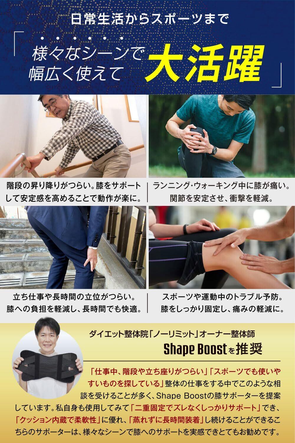 ①【欲しかったのは絶対的安心感】膝にトラブルがあると普段通りの日常生活を送ることが難しくなります。階段の昇り降り、ウォーキング、ランニング、立ち仕事やスポーツなどが今まで通りできないというのはとても辛いことです。そんな方が安心して日々を過ごせるようにしっかりと膝周りをサポートします。