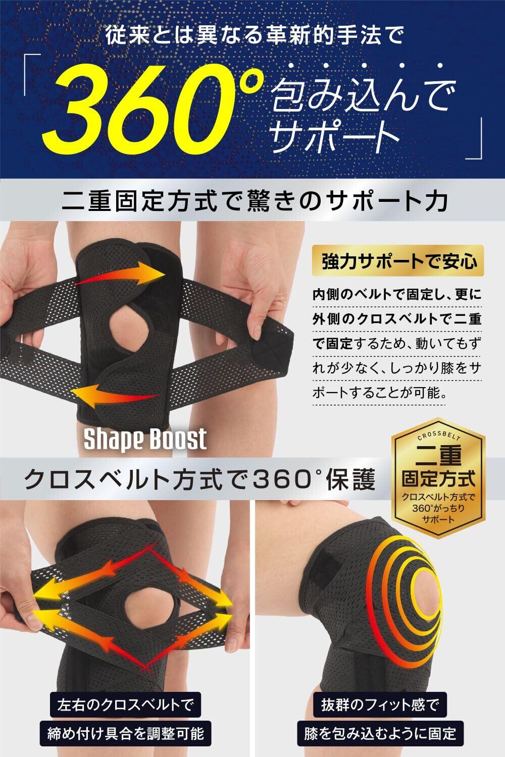 ②【従来とは異なる革新的手法】本商品は二重固定方式を採用しており従来の膝サポーターよりもサポート力が向上しております。またクロスベルト方式により360°膝を包み込むように固定するのでフィット感も向上しております。