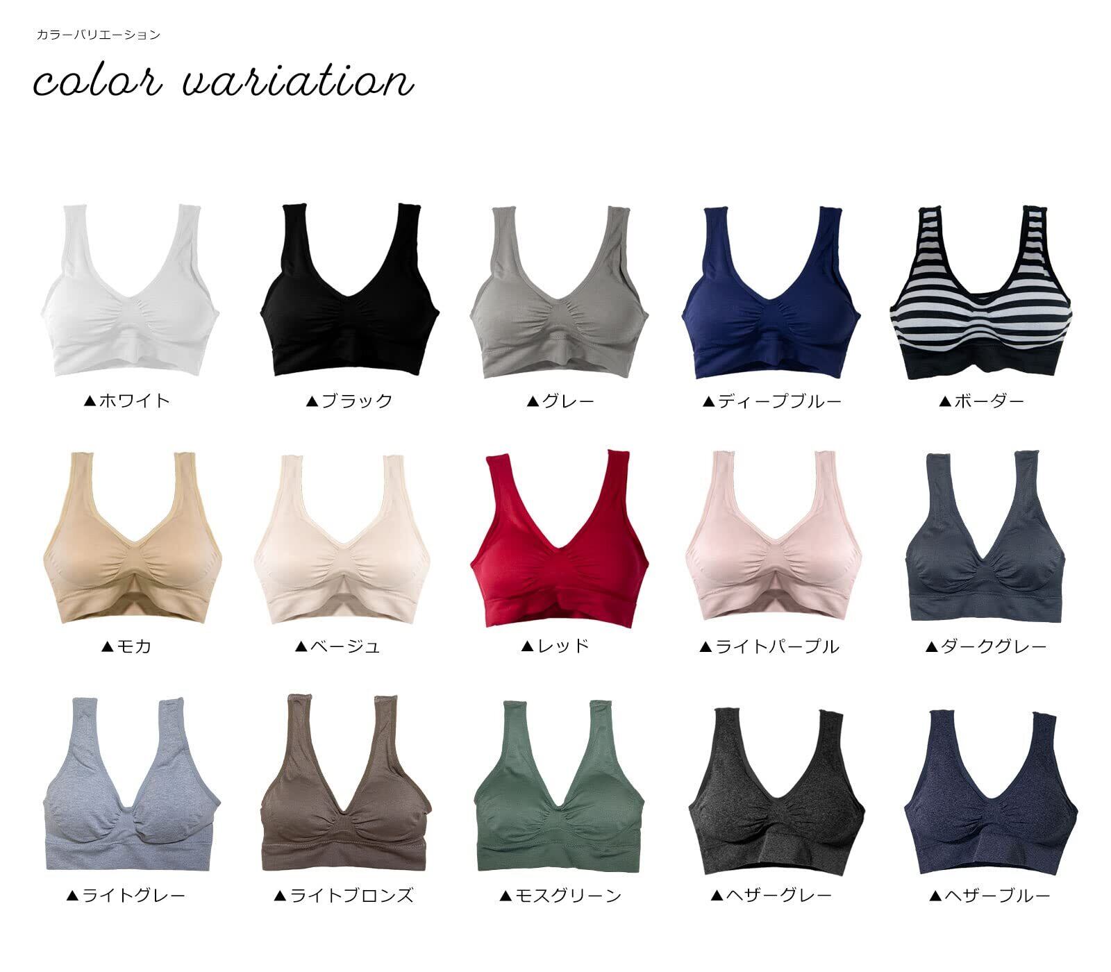 ・カラーは、ブラック・ホワイト・グレー・モカ・ライトパープル・ベージュ・レッド・ディープブルー・ヘザーグレー・ヘザーブルーの10色から、サイズは、M・L・XLの54サイズからとなっております。※こちらの商品はブラ単品での販売となっております。詳しいサイズはサイズ表を参考にお選びください