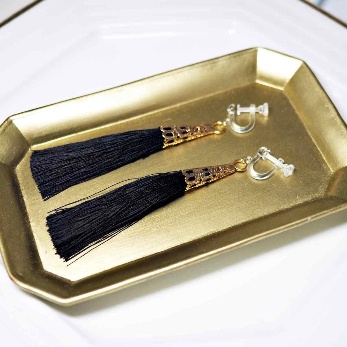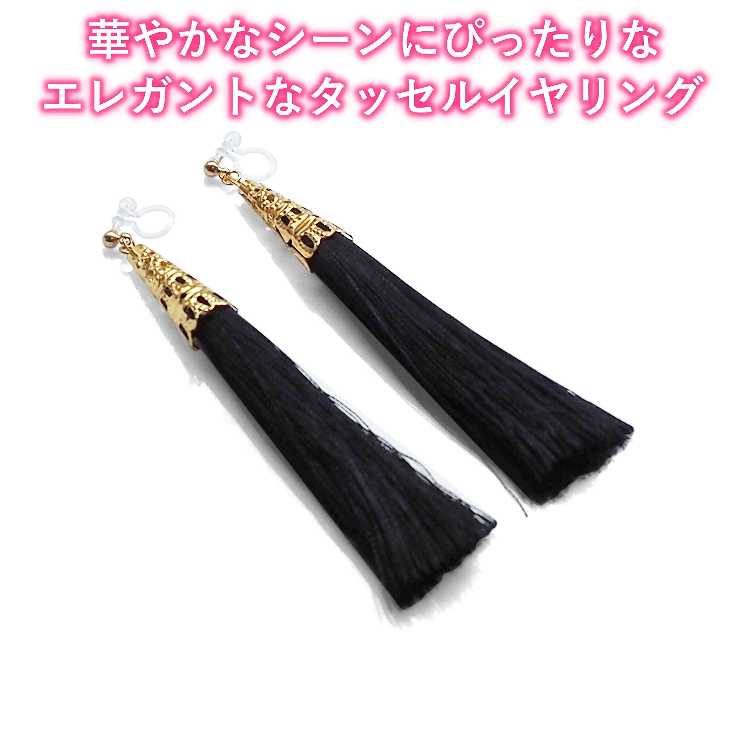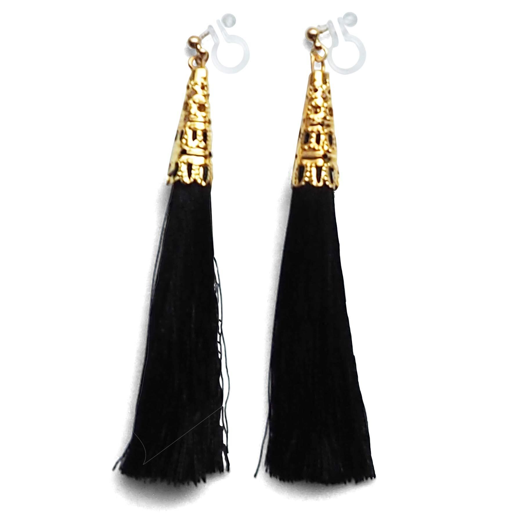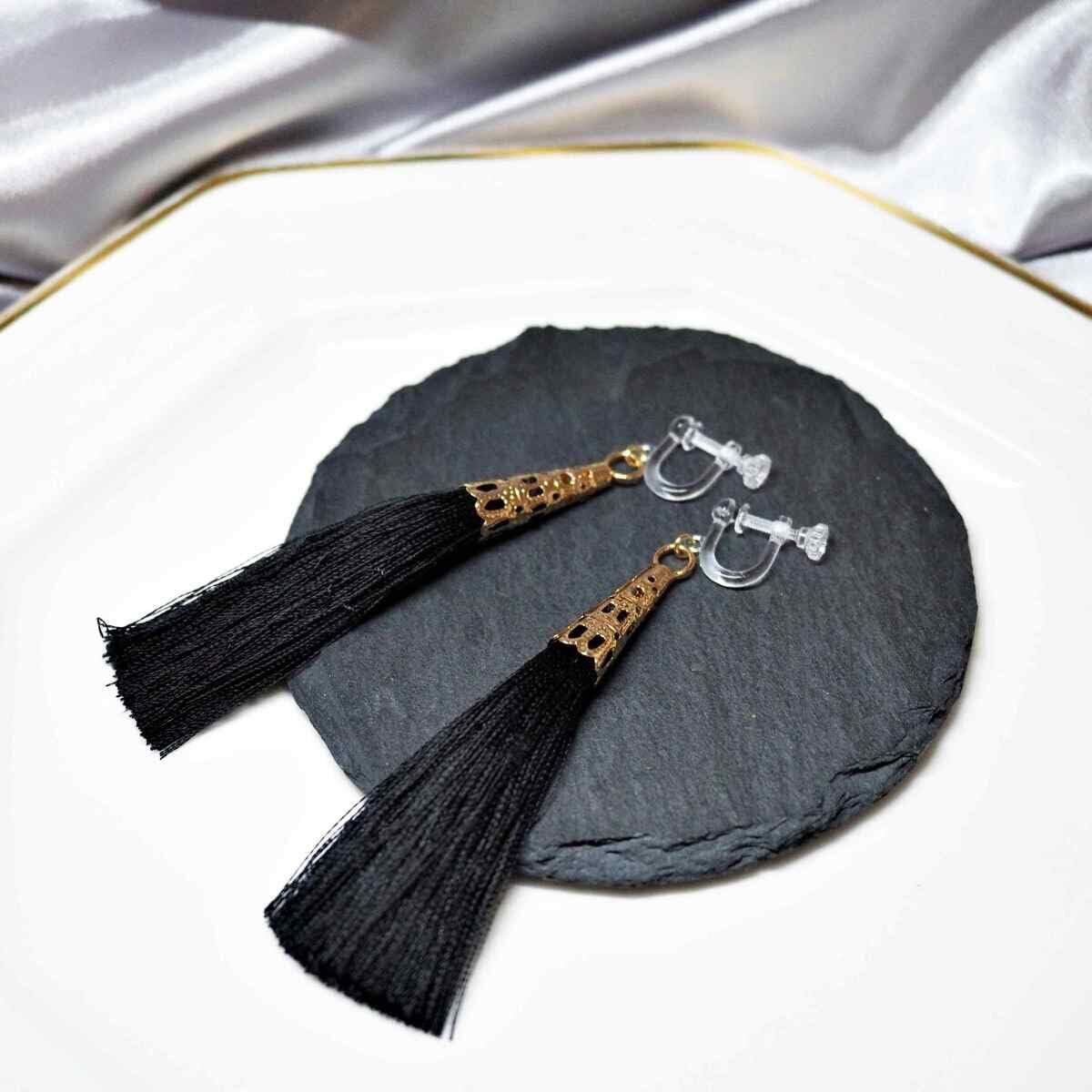 【特価セール】樹脂製 揺れる ロング 黒 タッセル イヤリング 大ぶり ピアス風 ブラック フリンジ ノンホールピアス 人気 シンプル イヤリング レディース アクセサリー ミヤビグレース ゴールド 【 イアリング 】(ブラック) | gsmshop