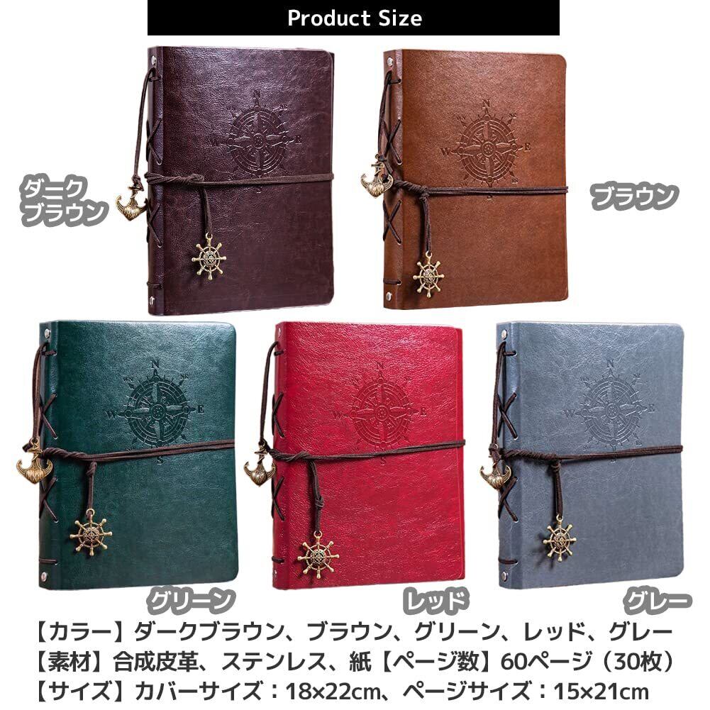 【カラー】ダークブラウン、ブラウン、グリーン、レッド、グレー【素材】合成皮革、ステンレス、紙【ページ数】60ページ(30枚)【サイズ】カバーサイズ:18×22㎝、ページサイズ:15×21㎝