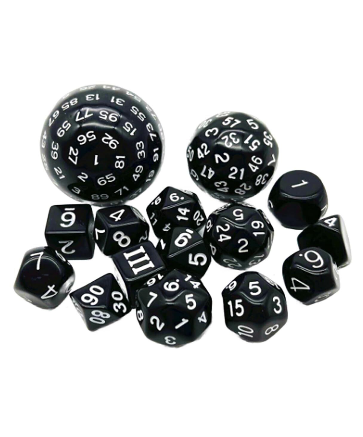 様々な種類の3~100面サイコロ15個セットです。ホワイトとブラックの2カラーからお選びいただけます。