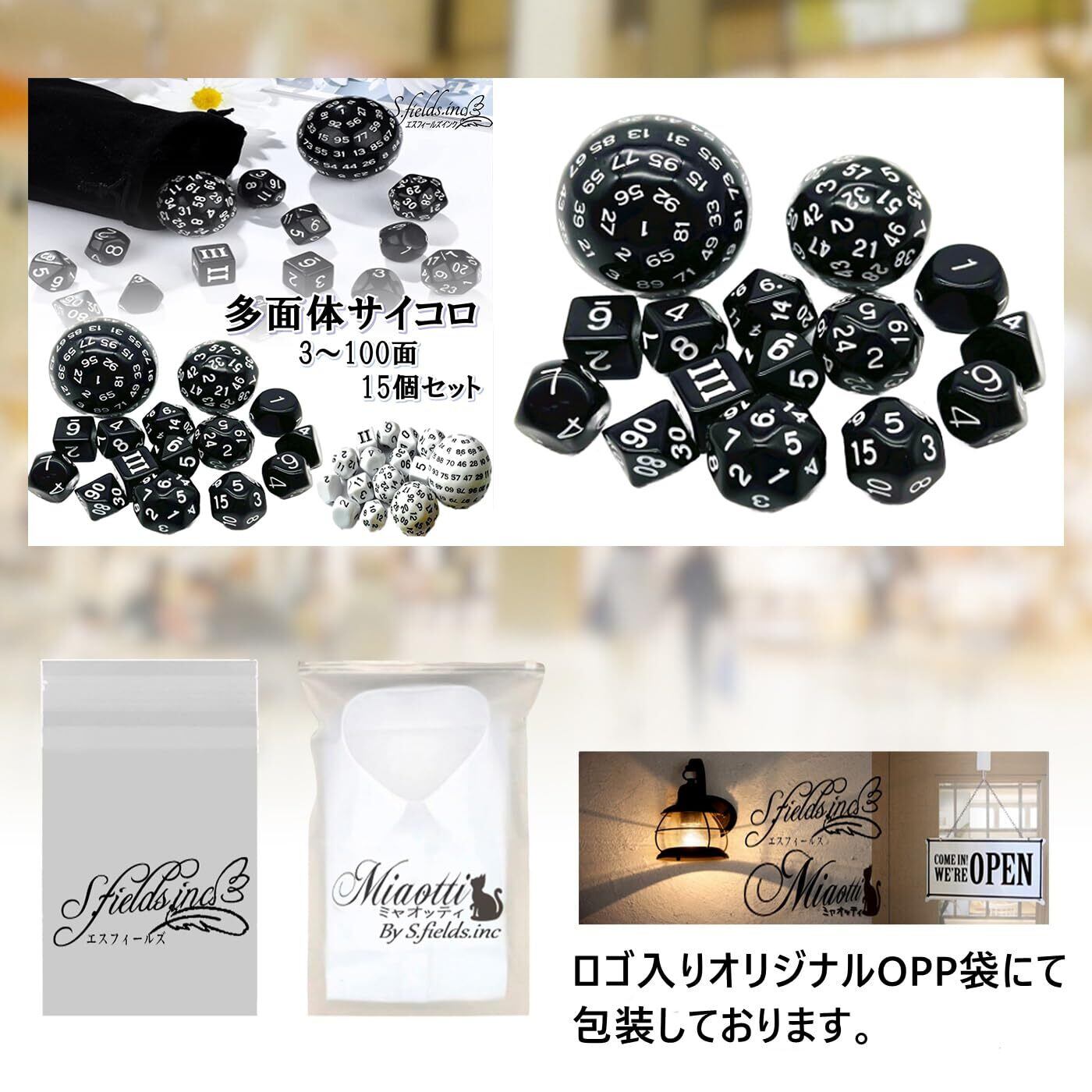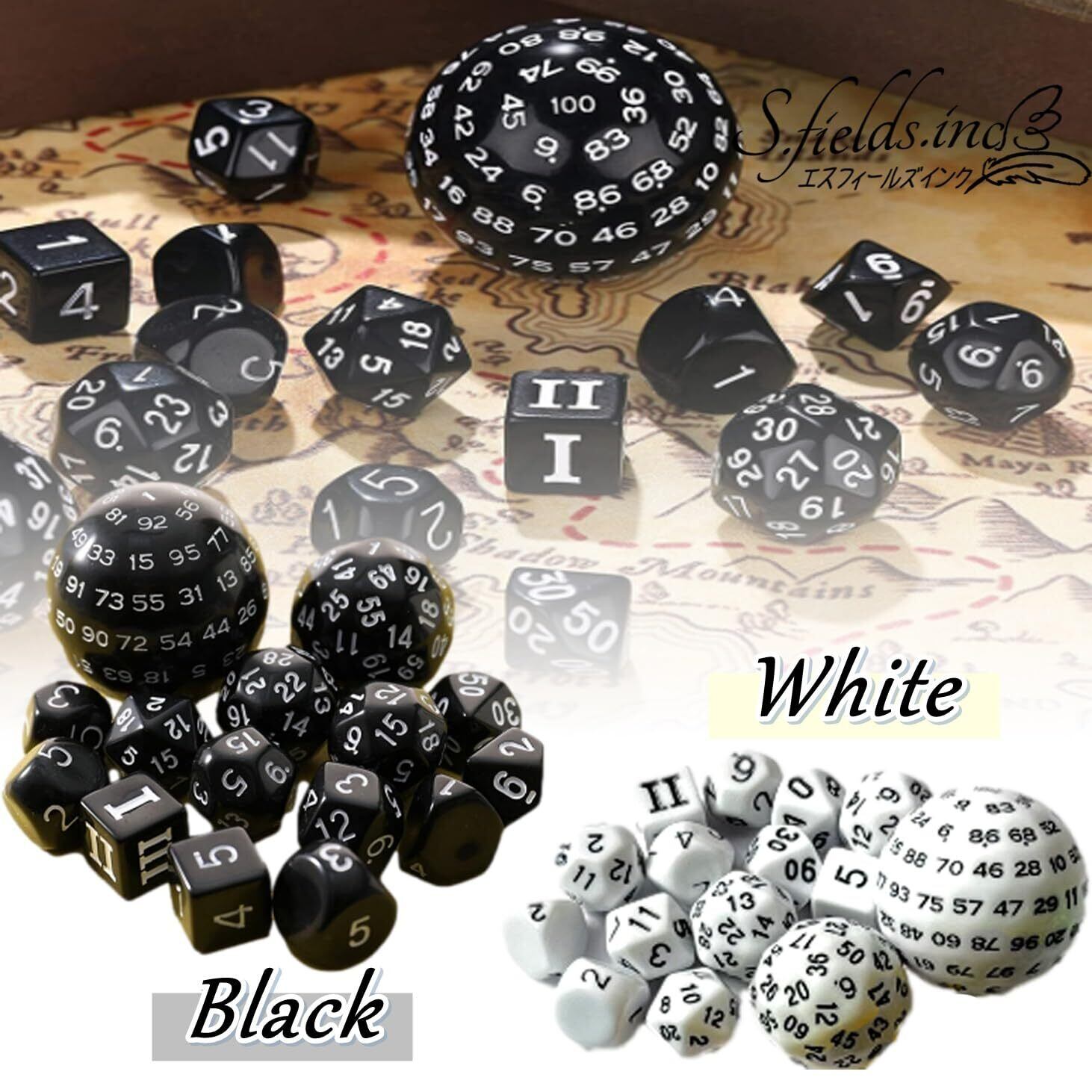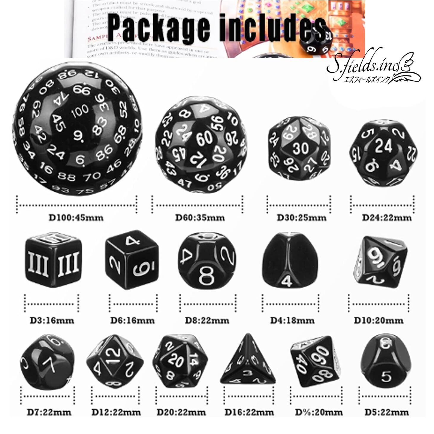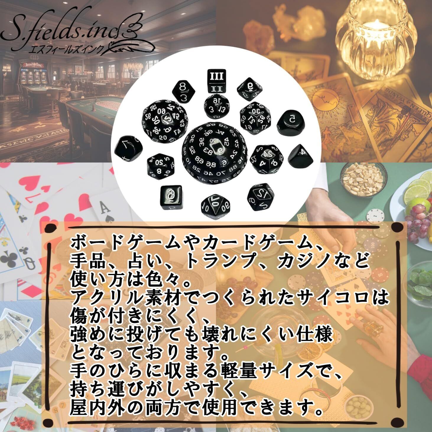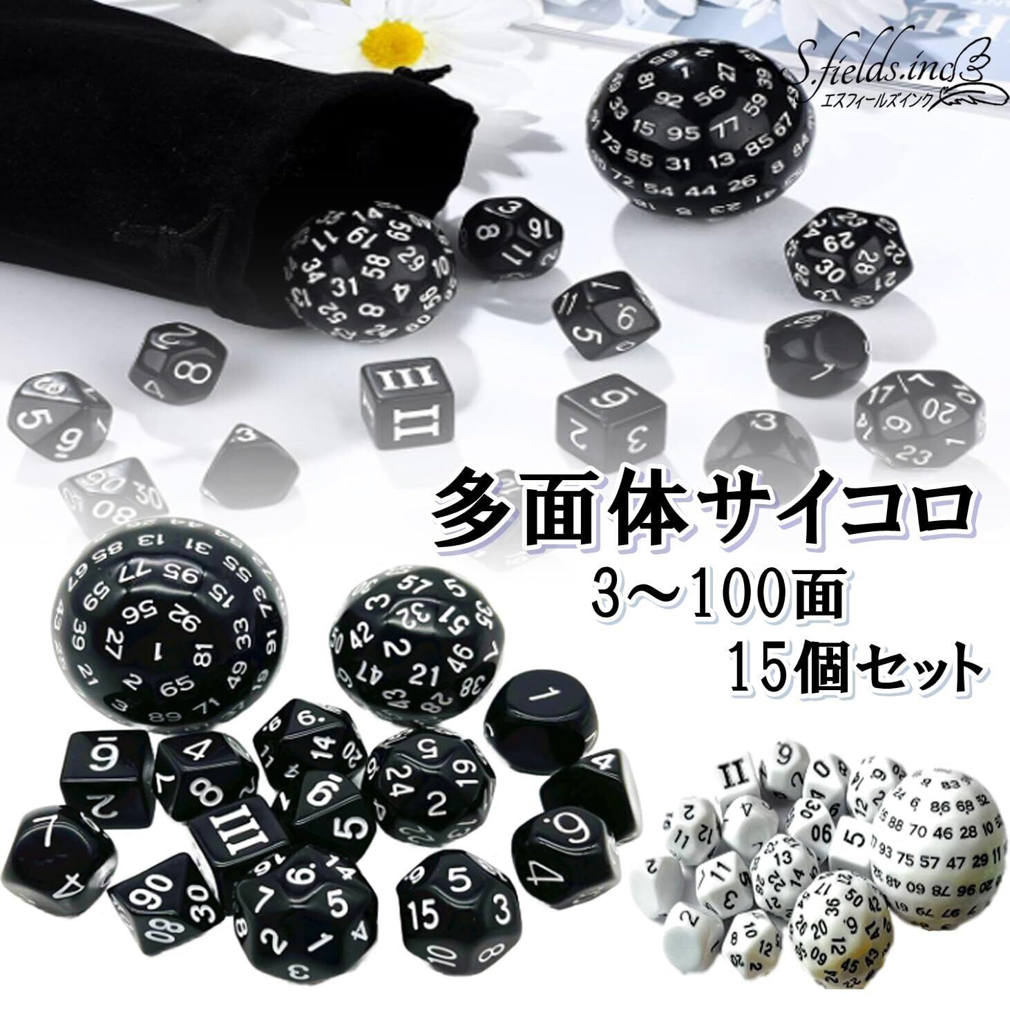 S.fields.inc 100面ダイス 多面体サイコロセット 百面ダイス 15個入り 3~10面 20 30 60面 (ブラック)