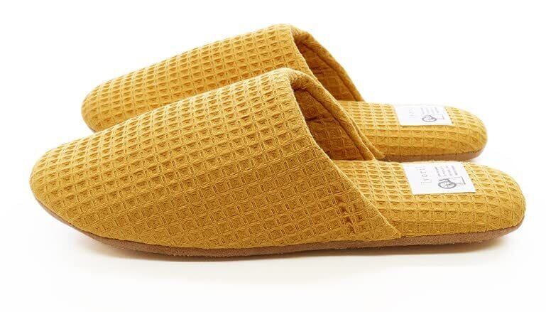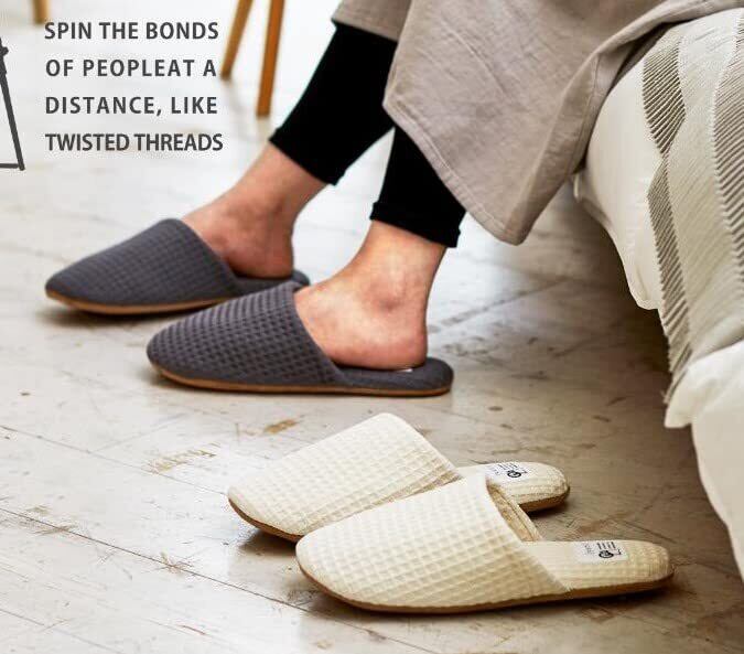 綿花のみで撚った綿100%の履き心地のルームシューズはお揃いで履いたり、プレゼントとして贈ったりしてもOK吸水性に優れたワッフル生地の特徴、表面の凸凹により肌への接地面が少ない為、履き心地がサラッと快適