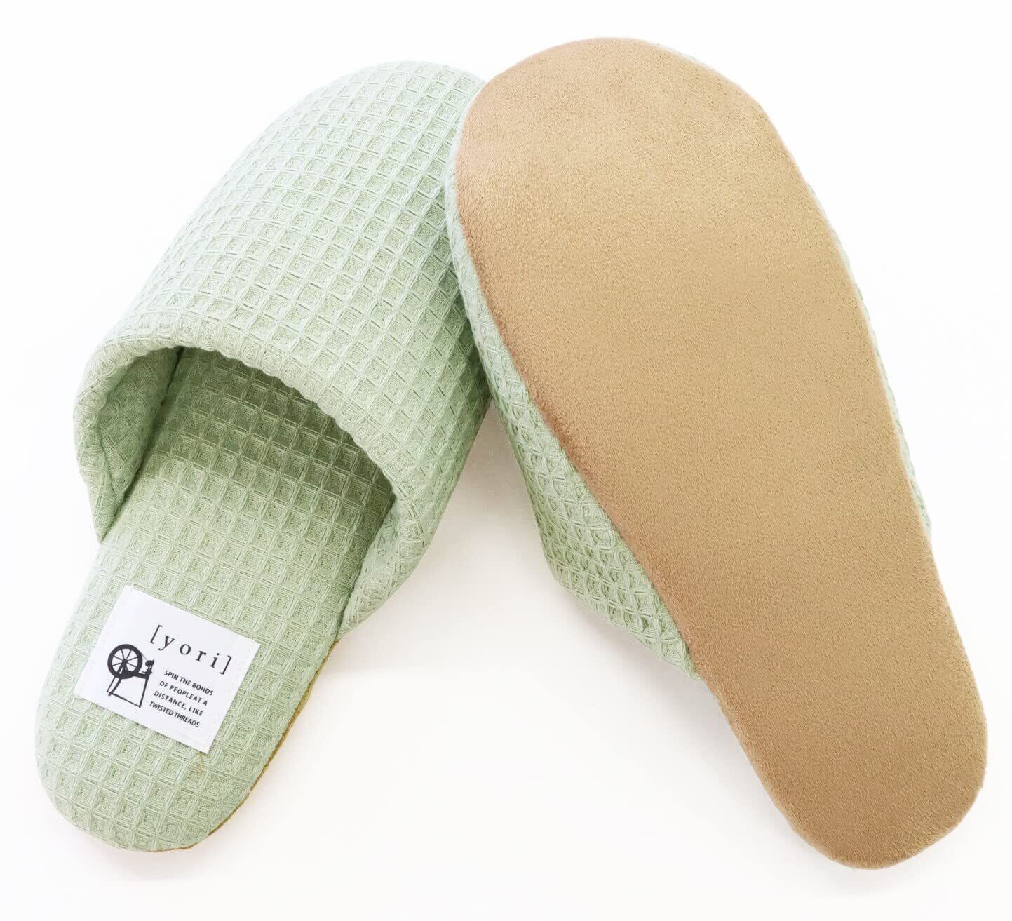 底はパタパタ音が鳴りにくいポリエステルスエード素材を使用していいます男性、女性にもお使いいただけるサイズなので、ギフトにもおススメの1足ですyoriは糸を紡ぐ撚り(ヨリ)から名付けられたスリッパで、人との距離を、気持ちを紡ぐ商品になればと思って作られました