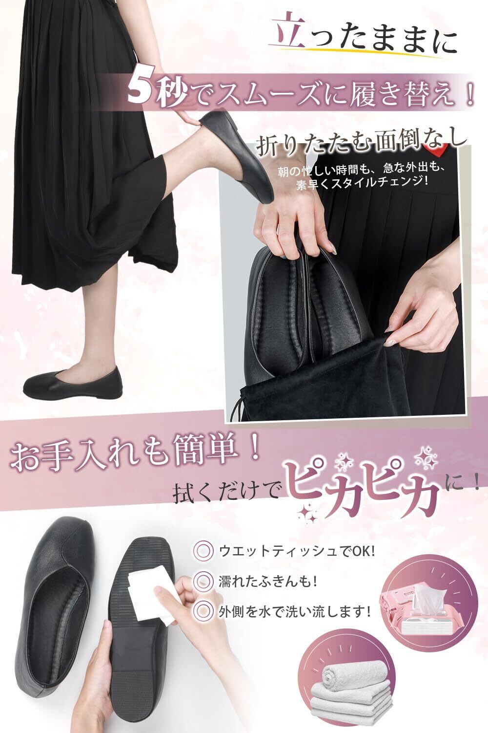 [YAKIDA] 携帯スリッパ レディース 女性用 携帯すりっぱ 【柔らかい靴底・3重スポンジ】 フォーマルスリッパ 静か 卒業式 持ち運び 入学式 学校 参観 機内 収納ポーチ付き