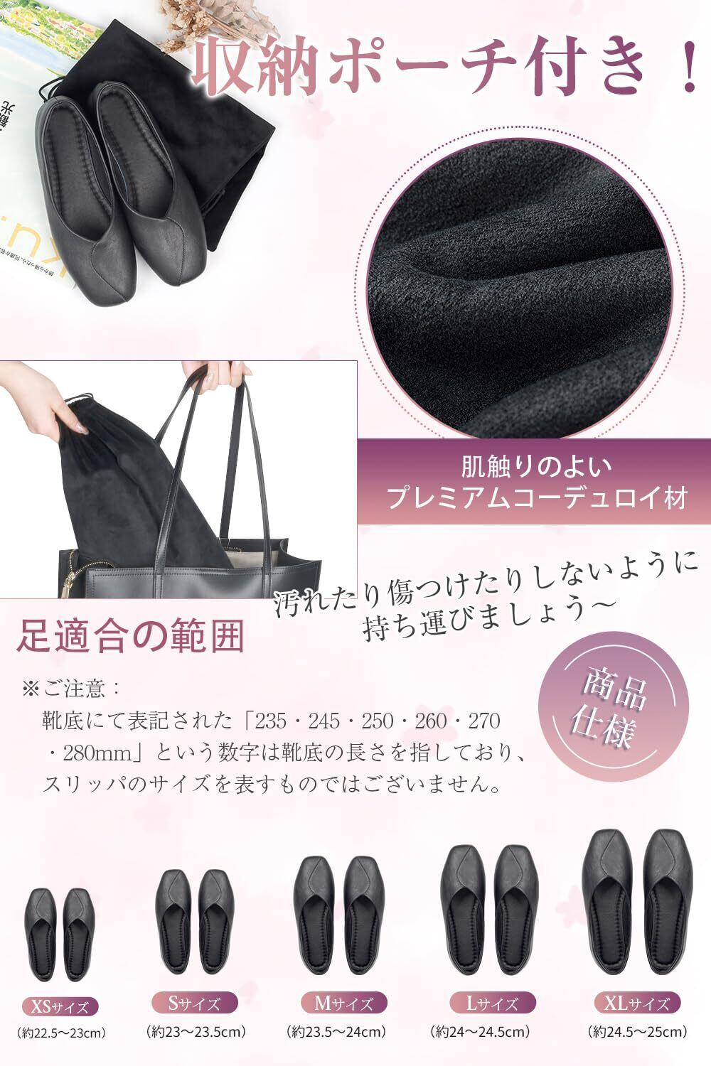 「オーエルに相応しいエレガンス!女性用携帯スリッパ」「商品仕様のご注意」※5つのサイズあり、足適合の範囲:XS(約22.5~23cm)S(約23~23.5cm)M(約23.5~24cm)L(約24~24.5cm)XL(約24.5~25cm)※お客様への知らせ:靴底にて表記された「235」という数字は靴底の長さを指しており、スリッパのサイズを表すものではございません。「商品素材」アッパー:PUレザー インソール:PUレザー&スポンジ 靴底:ゴム 靴なので、多少においがする場合がありますが、風通しの良い場所にしばらく置いておけば消えます。