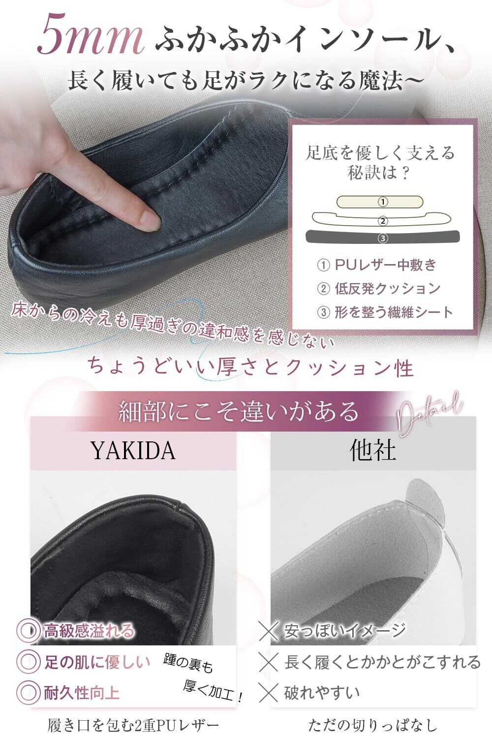 「柔らかいEVAソールはパタパタしない、3層クッションで疲れ知らずに」しなやかなEVA素材のソールが、足の動きに自然にフィットしながら、プロリーグに傷つけたりパタパタしたりしないです。曲げてもすぐに元に戻る弾力性で、歩くたびに心地よい反発力を感じられます。軽量で持ち運びも便利。滑りにくい底面加工で、雨の日や急いでいるときも安心。まるでスリッパのような軽さなのに、しっかりと足を支えてくれて頼もしいです。足裏を優しく包み込む3層構造の厚み5mmインソールが、歩くたびにふんわりと衝撃を吸収。通勤時の駅の階段も、長時間の立ち仕事も、足の負担を軽減。吸汗性に優れた素材で蒸れにくく、一日中快適な履き心地をキープする携帯すりっぱです。