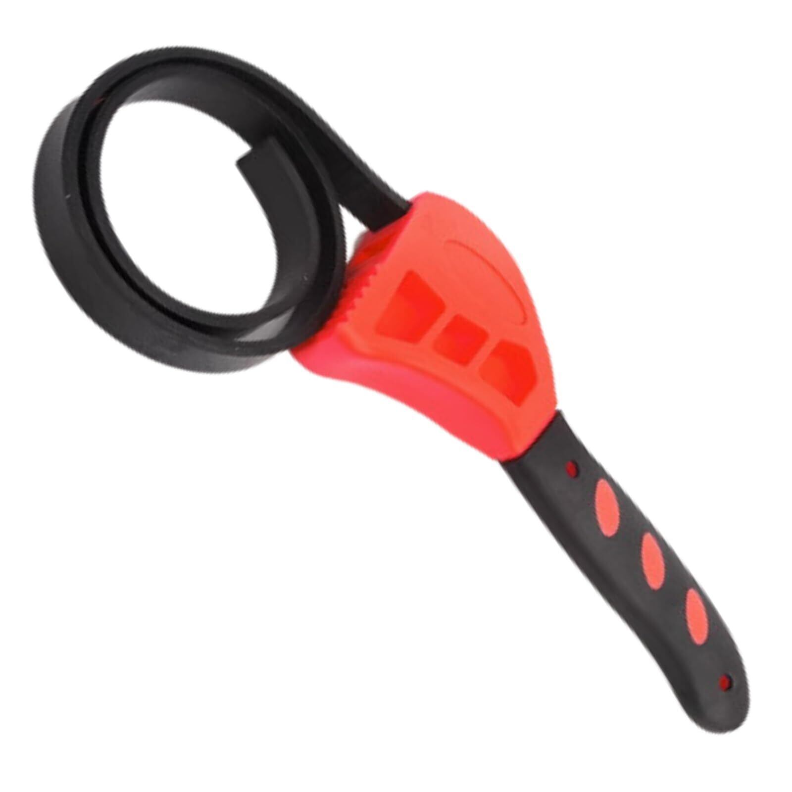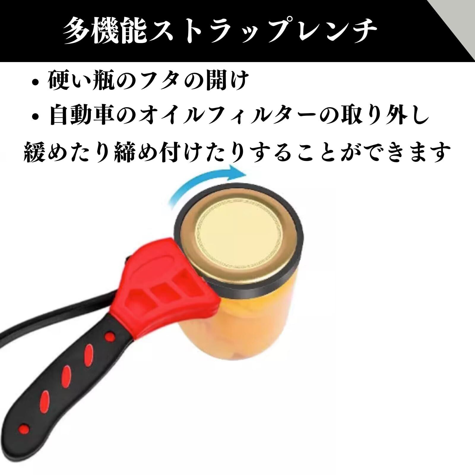 【多機能ストラップレンチ】硬い瓶のフタの開けから自動車のオイルフィルターの取り外しまで、緩めたり締め付けたりすることができる便利な多機能ストラップレンチです。
