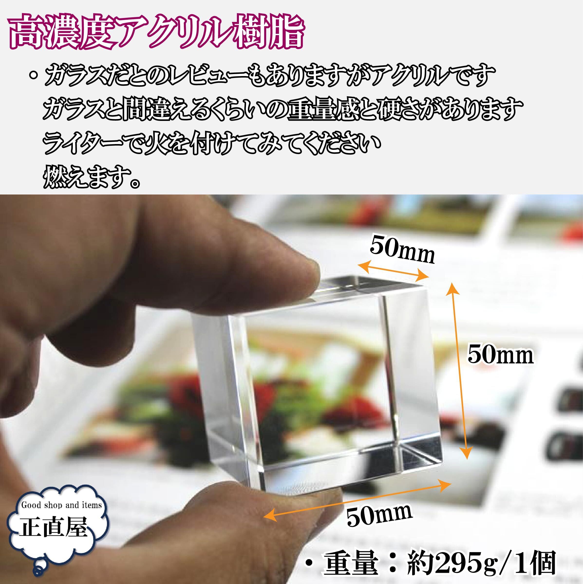 サイズ:5㎝✖5㎝✖5㎝ 2個セット *ガラスだとのレビューがありますが高濃度アクリル樹脂製です。カッター等では硬くて切れません。傷もつきません。ライター等で火をつけてみれば燃えます。