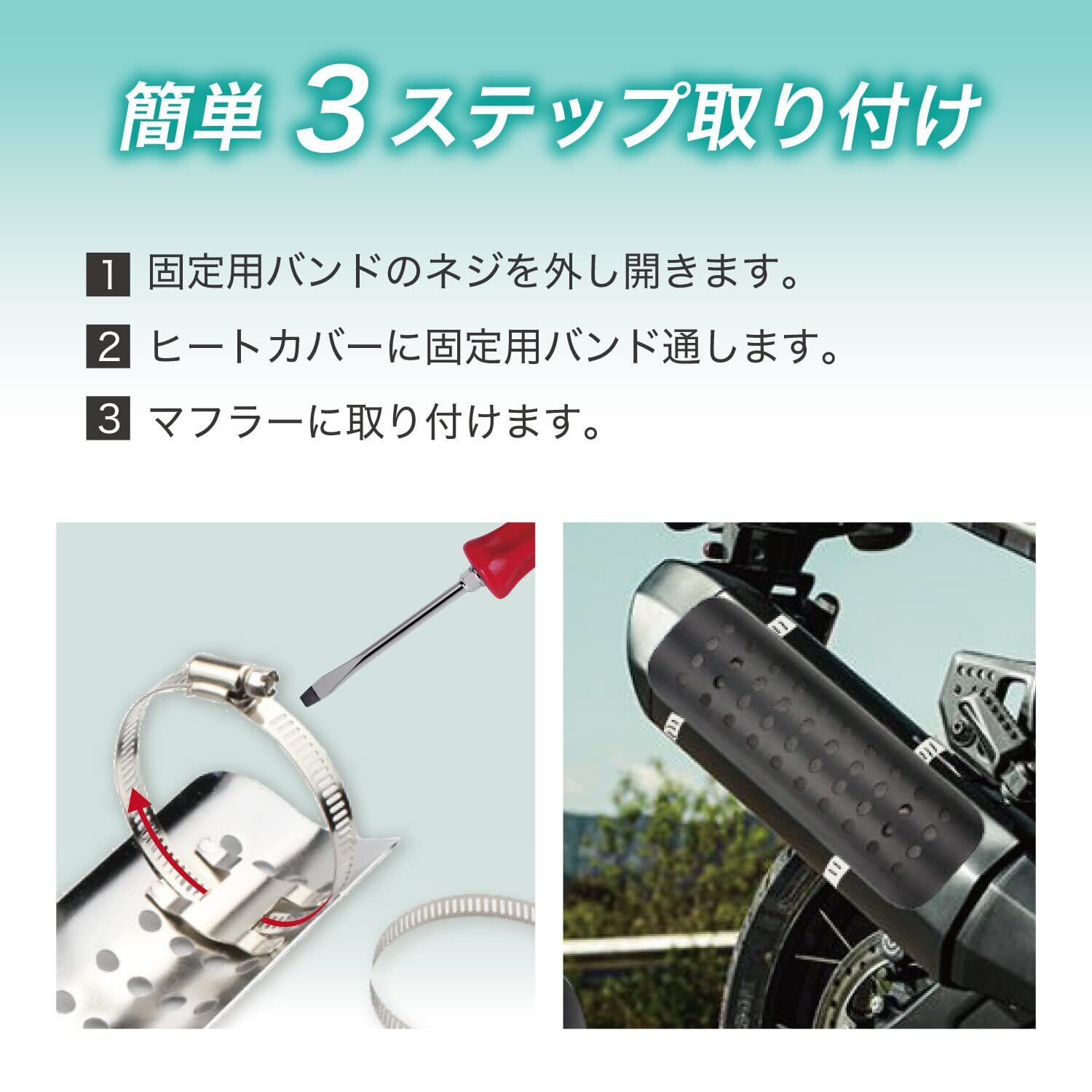 取付簡単:固定用バンドのネジを開き、ヒートカバーにバンドを通します。その後目的のパイプやマフラーに取り付け、バンドを締めます。(取扱説明書は同梱しておりません)