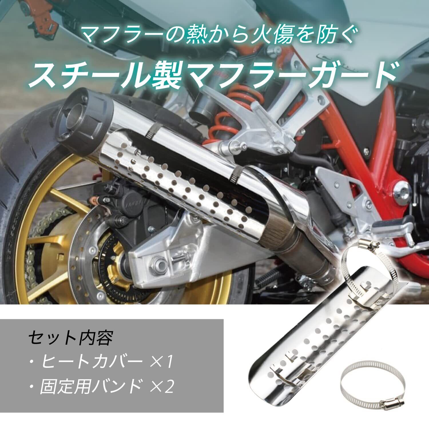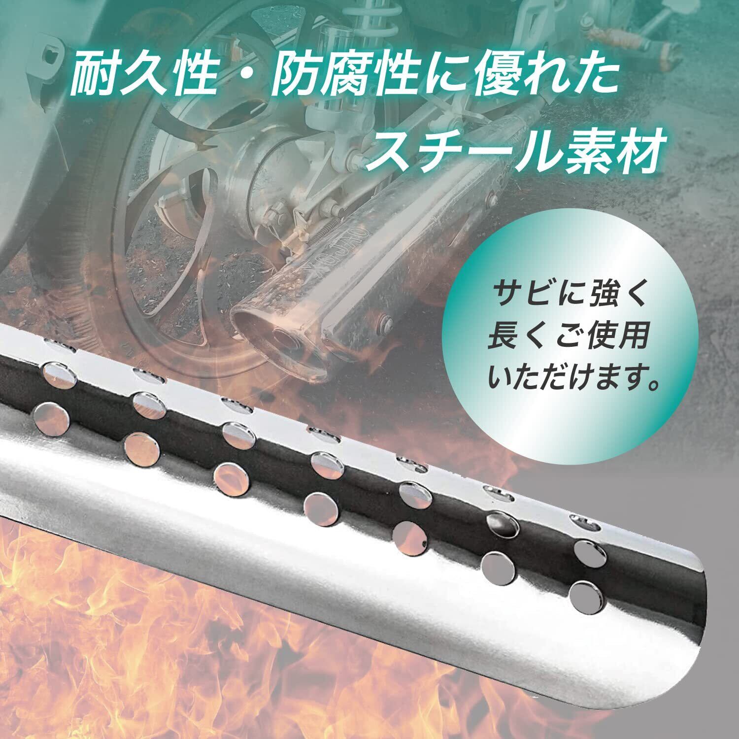 高品質のスチール製で熱に強く、耐久性、防錆性、防腐性に優れています。排熱で熱くなったマフラーやエキゾーストパイプをカバーし、火傷や衣類の焦げを防止します。また、ヒートシールドの役割だけでなく、本体の傷防止にも役立ちます。