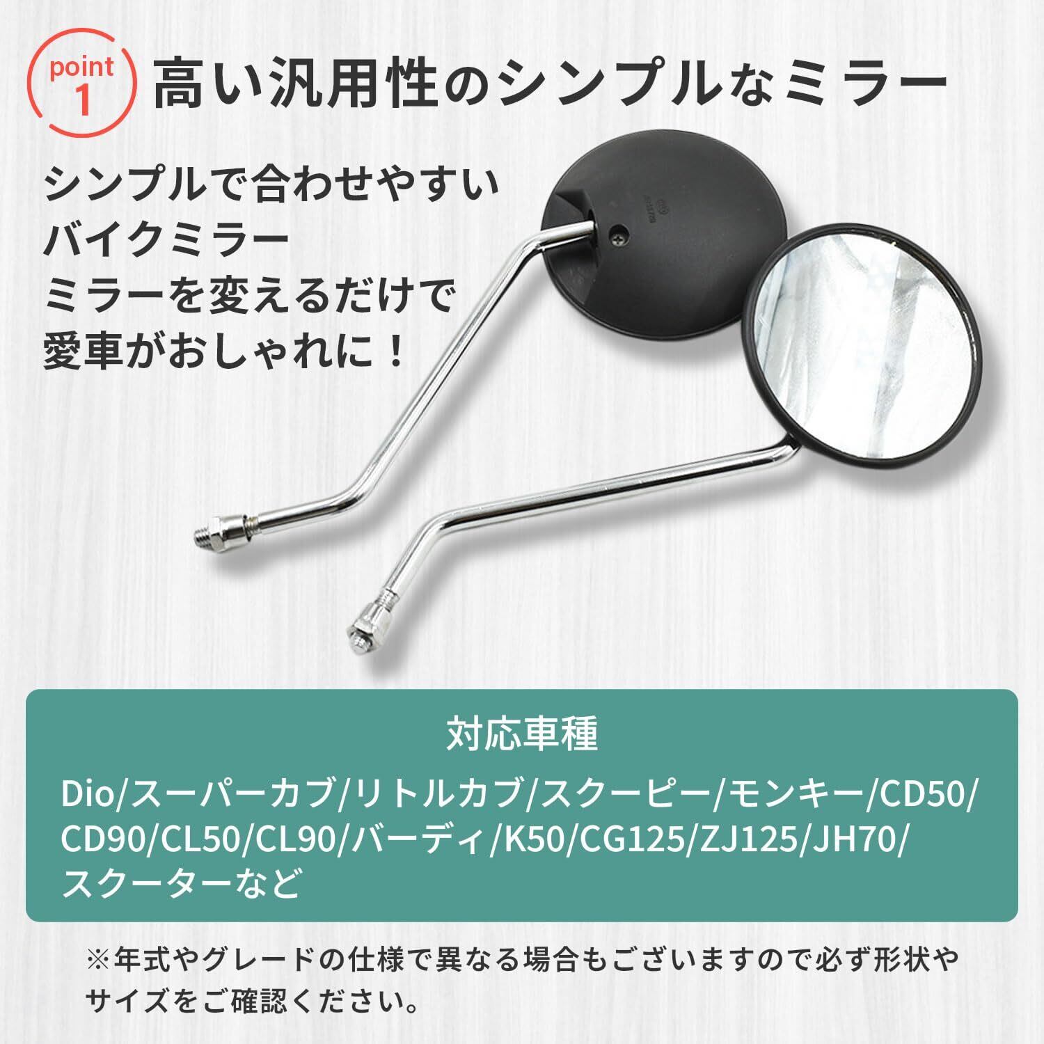 高い汎用性:バイク ミラー 丸はサイズが合えばご利用いただけます。※年式やグレードの仕様で異なる場合もあるので必ず形状やサイズをご確認してください。※車種や取付け位置によっては、ご自身が死角となって後ろが見えにくくなる場合もございます。※細かな寸法は、ご購入前に必ずご自身のバイクと照らし合わせてご確認くださいませ。