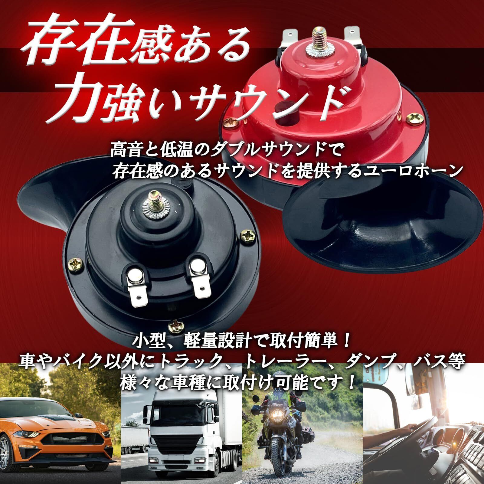 【商品詳細】電圧:12V/24V、カラー:ブラック(黒)/レッド(赤)、周波数:高音(HI)510Hz/低温(LOW)410Hz、音量:95dB~110dB、付属品:取付けステー(ブラケット)2枚、ナット2個、材質:ABS ※配線や取説は付属しておりません。