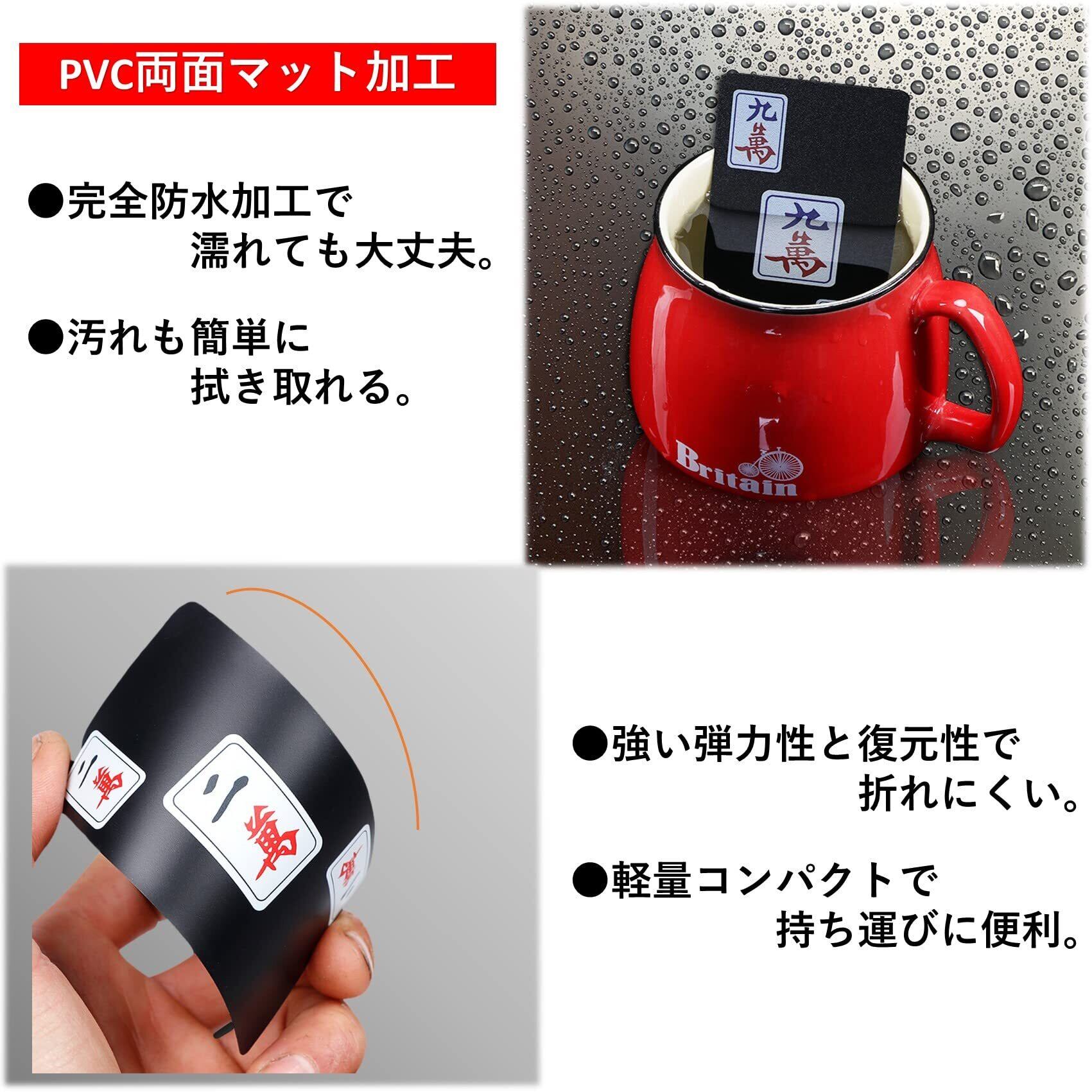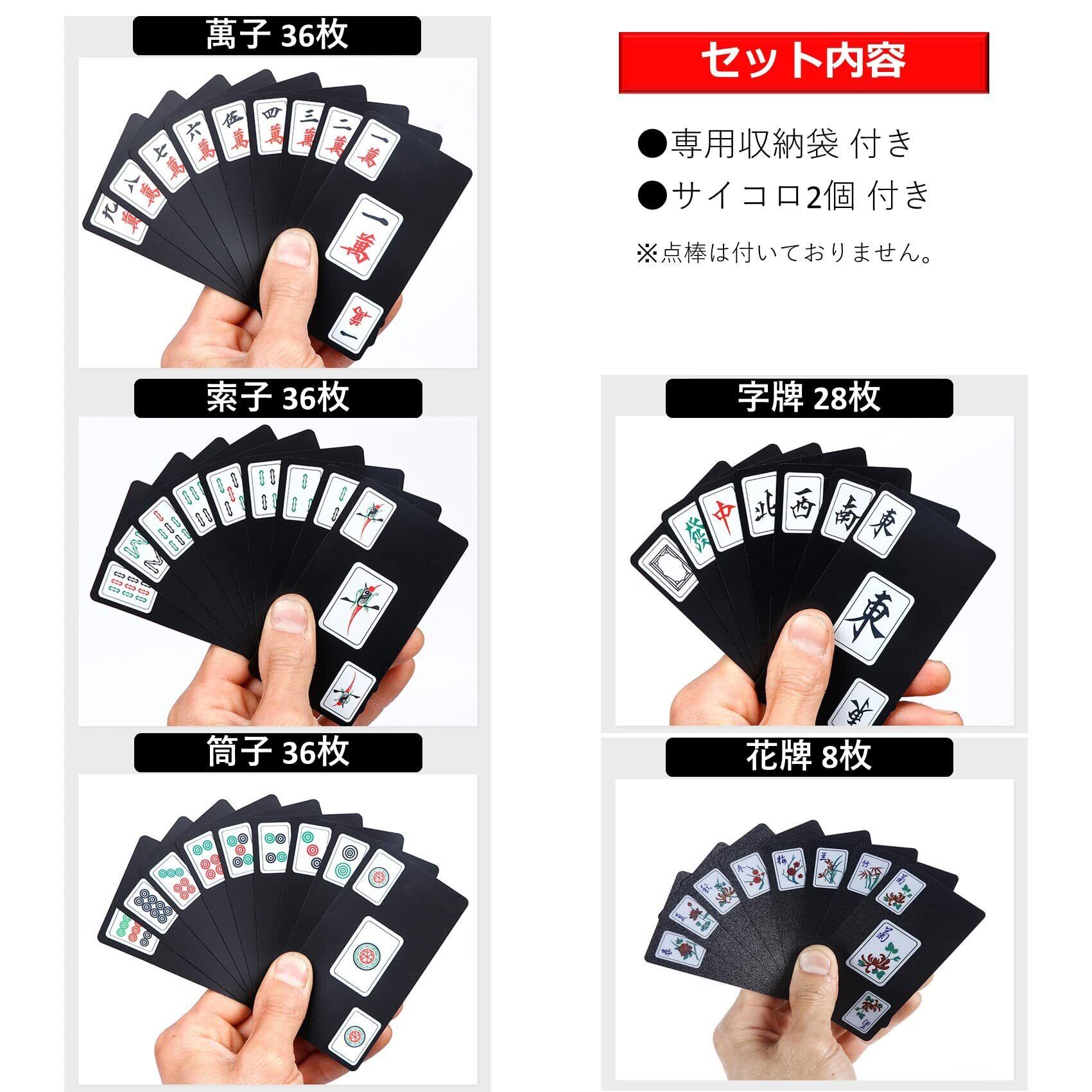 【セット枚数・内容】144枚(萬子36枚 筒子36枚 索子36枚 字牌28枚 花牌8枚)収納袋、サイコロ2個付き。軽量コンパクトで場所をとりません。