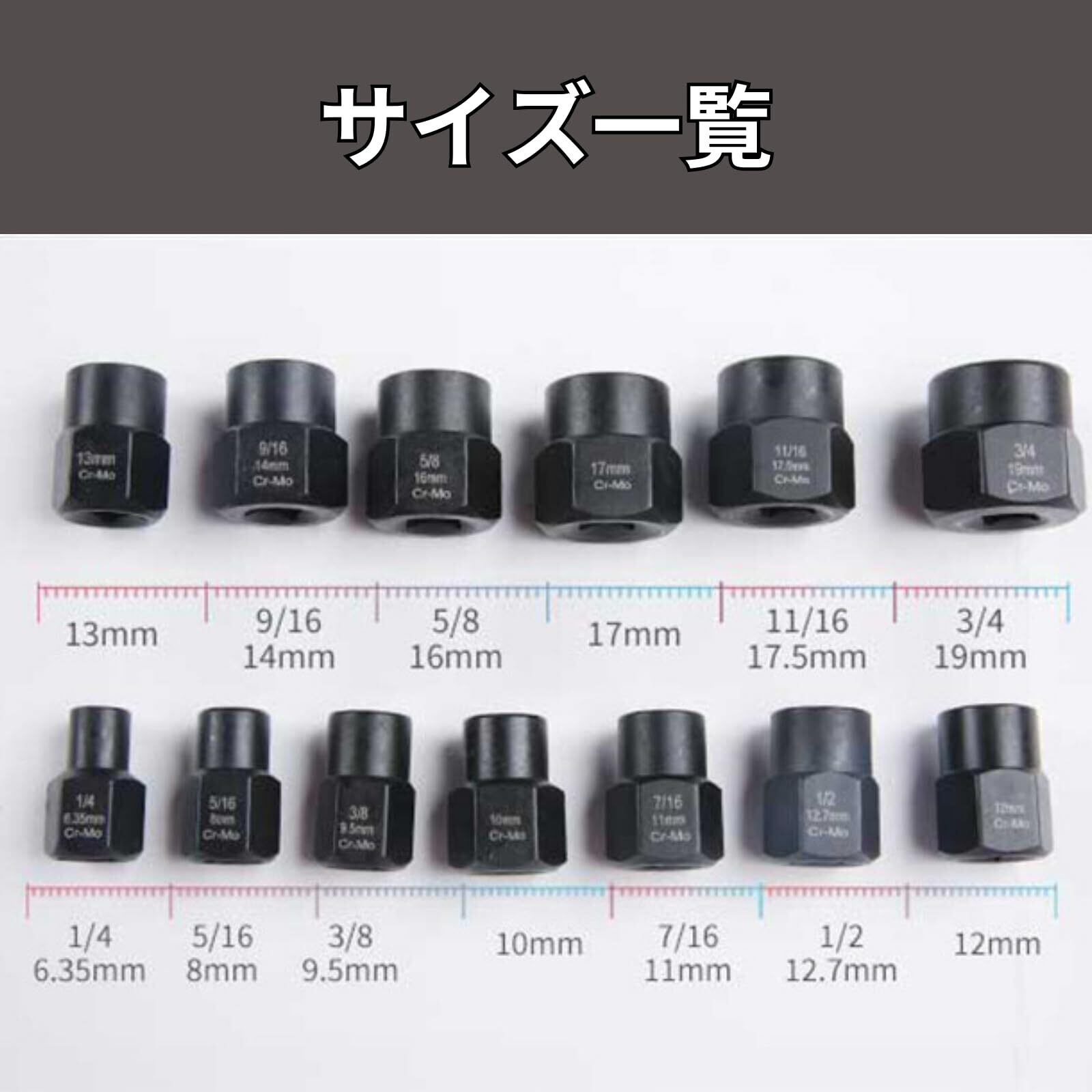 ・セット内容:6.35mm/8mm/9.5mm/10mm/11mm/12mm/12.7mm/13mm/14mm/16mm/17mm/17.5mm/19mm