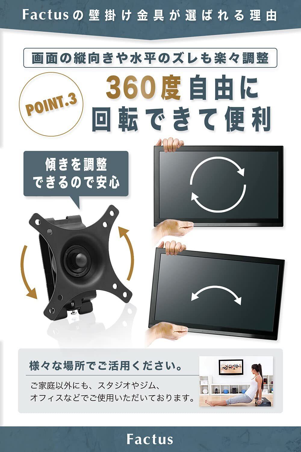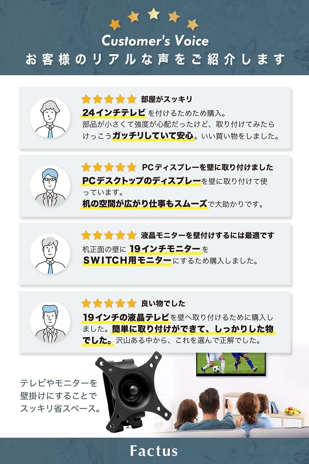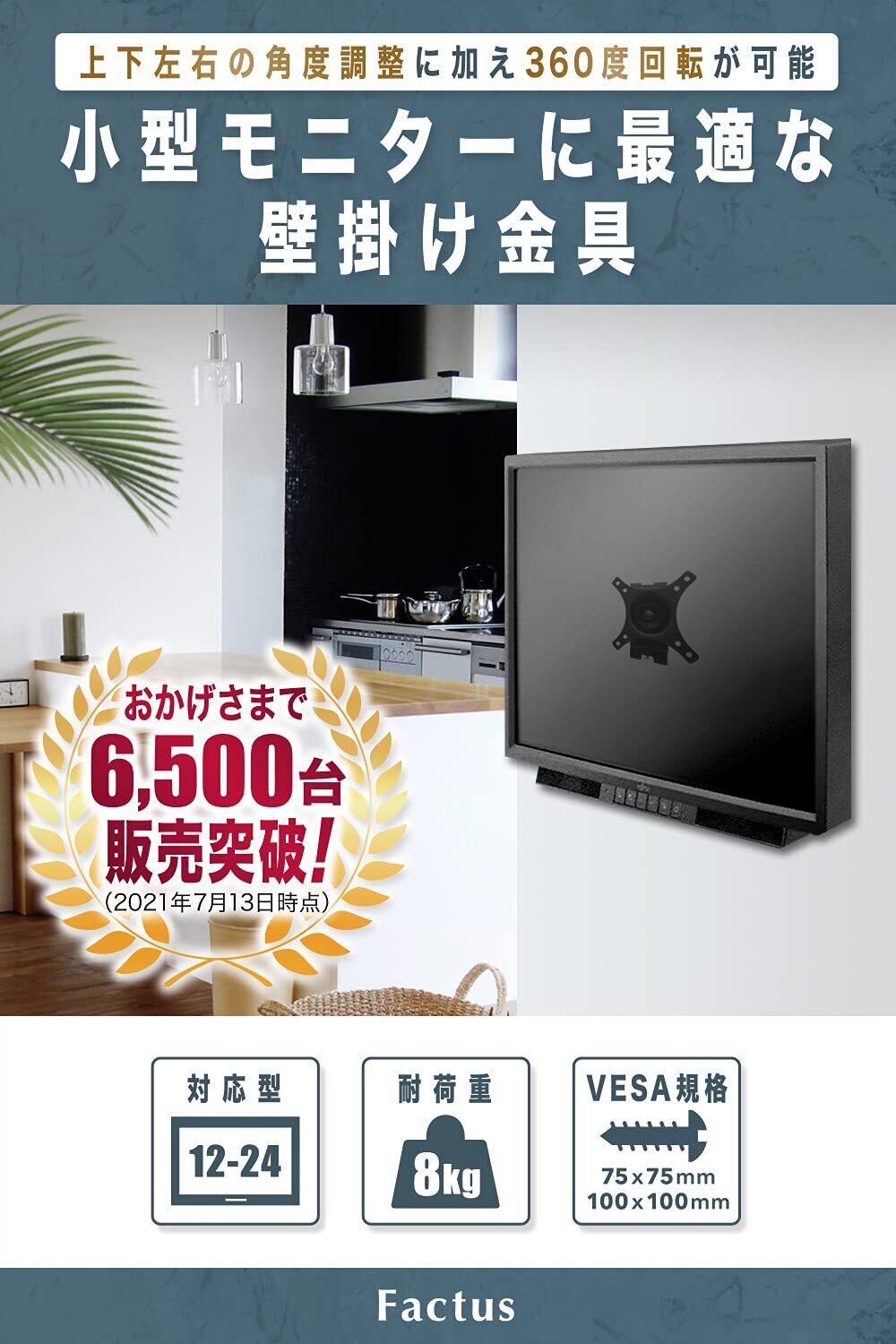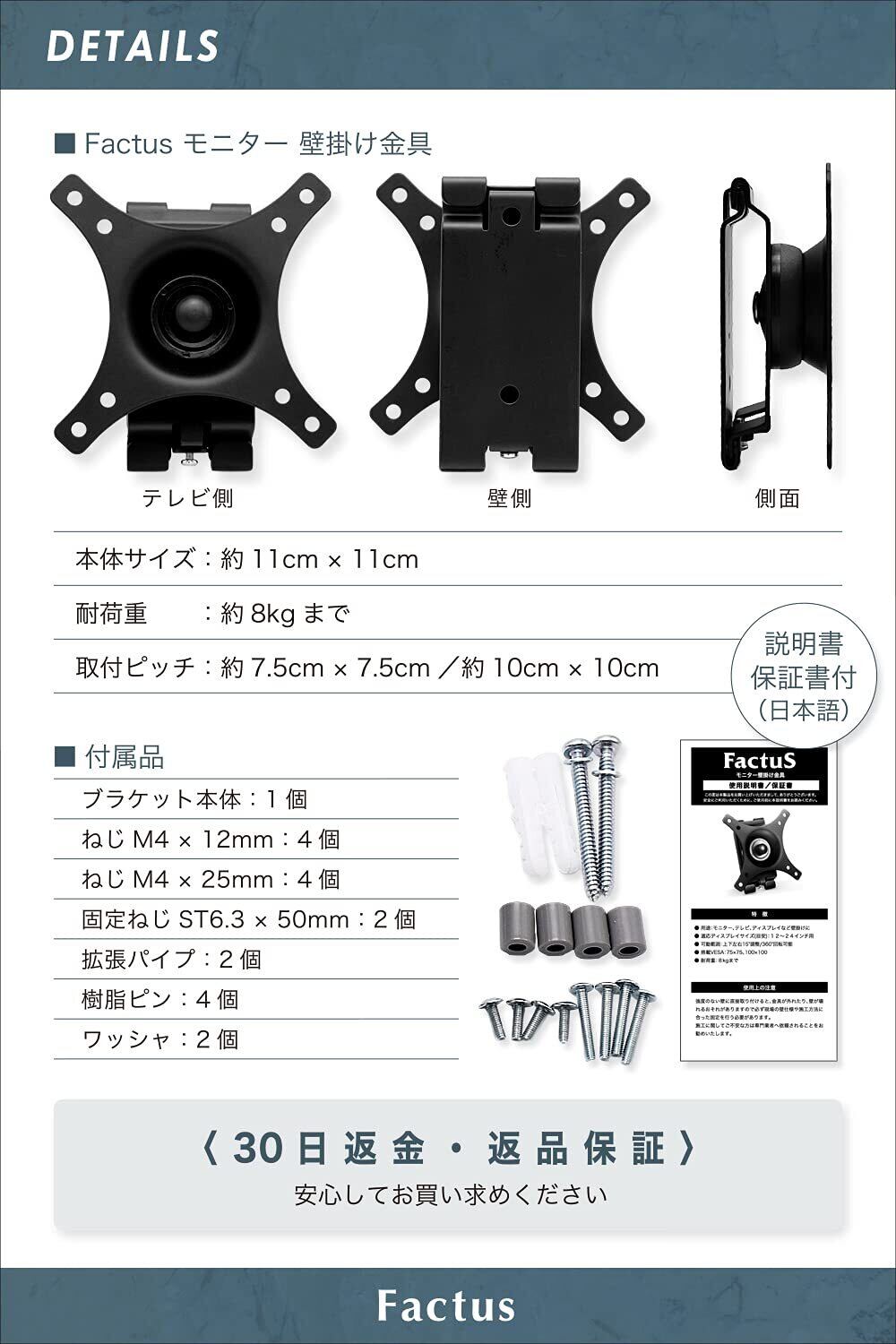 factus モニター 壁掛け金具 VESA 液晶テレビ 12-24インチ対応 上下左右角度調節可能 耐荷重8kg ネジ 取説付き