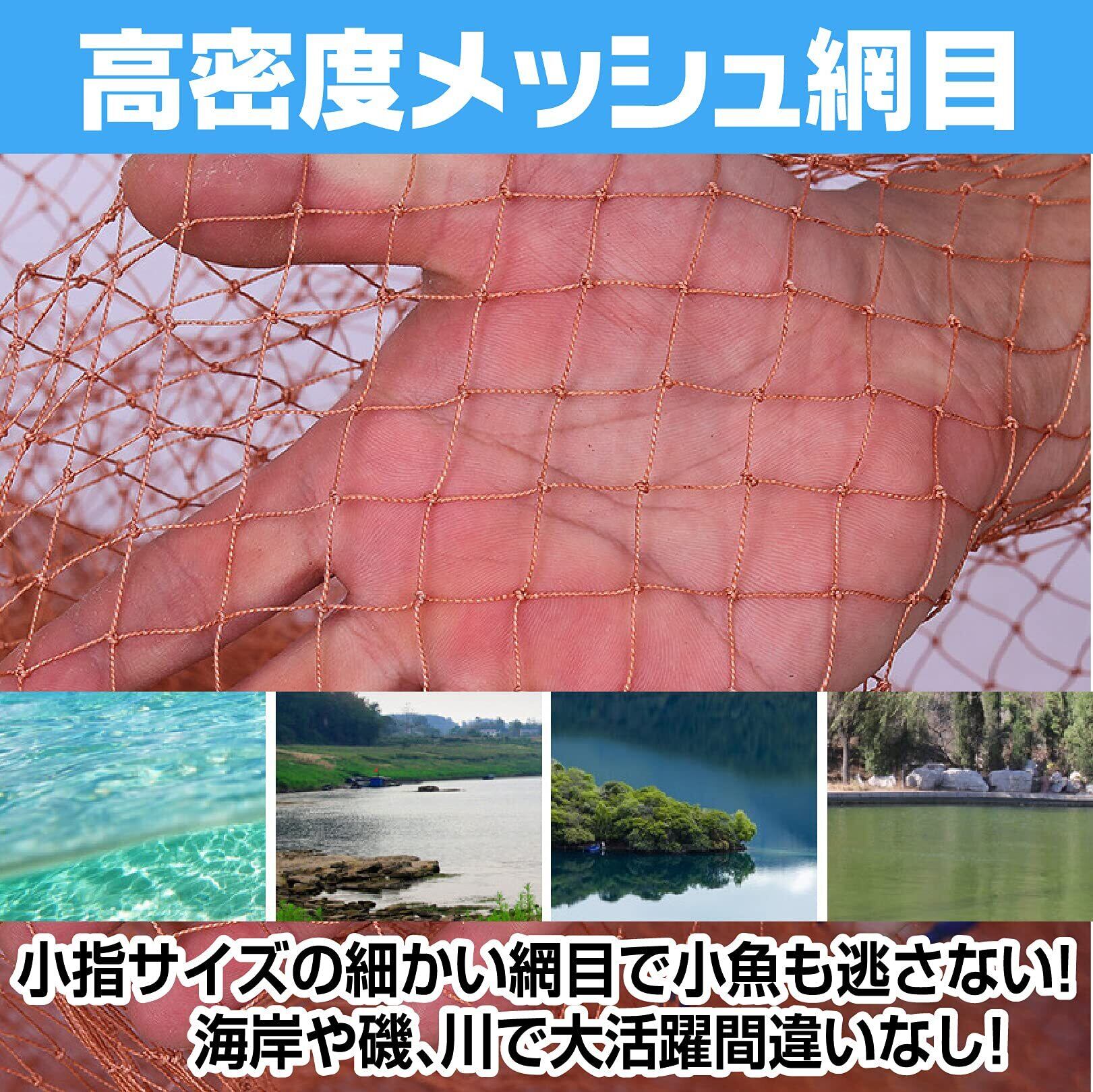 投網は、手掴みで捕まえることができない魚を手軽に、たくさん捕まえることができます。投入れ後、バランスよく網が広がり、つりがね状に沈んでいく様に錘が配置されています。総重量が軽く、投網や網丈が短いため、初心者でも扱い易いのが特徴です。 ナイロン製で水を吸わないので、より速く水に沈みます。手軽な釣り具・漁具としてお試しください。鮎釣りもとあみで挑戦!