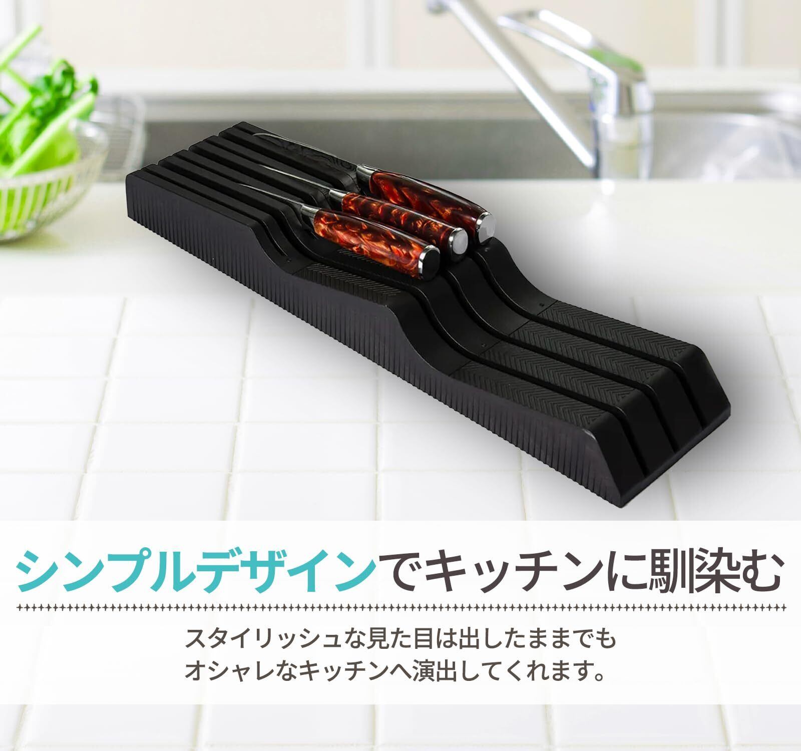 特徴:丸洗い可能、シンプルかつスタイリッシュなデザイン。平置きタイプなので包丁の取り出しがとても簡単