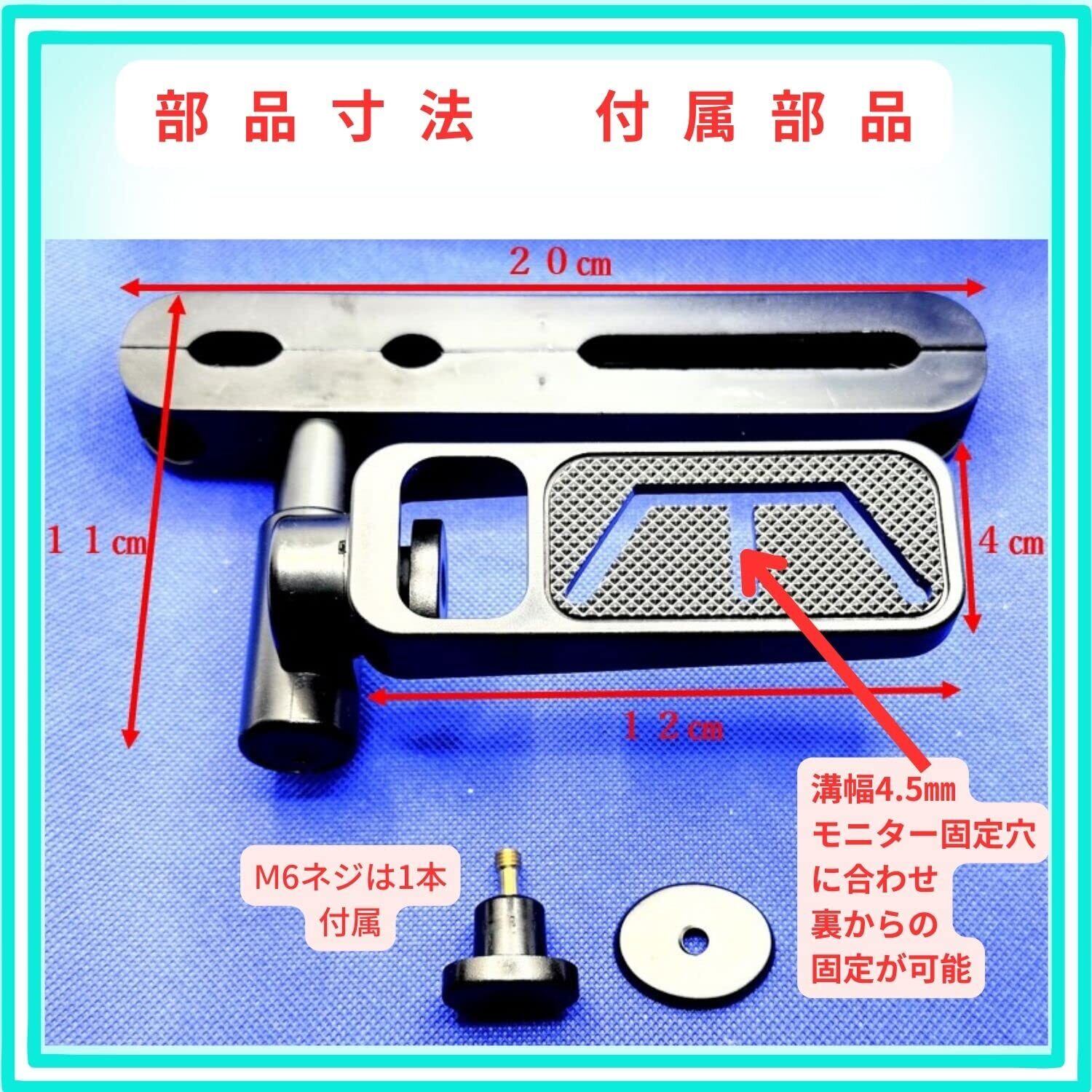 ヘッドレスト ブラケット モニター取付台にはⅯ6のネジを1本ご用意、他にも汎用性を高める取付溝が沢山ありますので各種モニターに応じ2点・3点止めも可能となり安定させる事ができます。