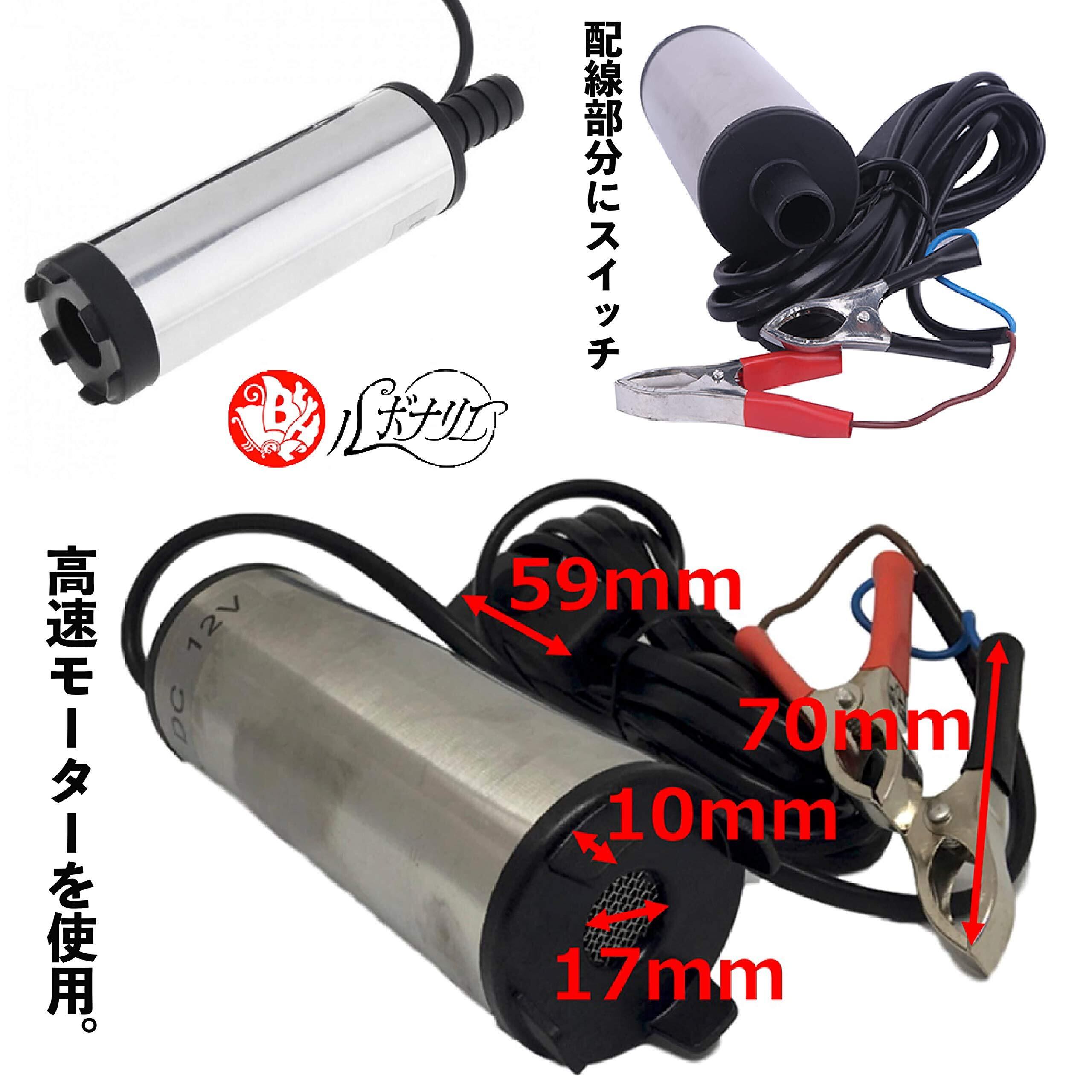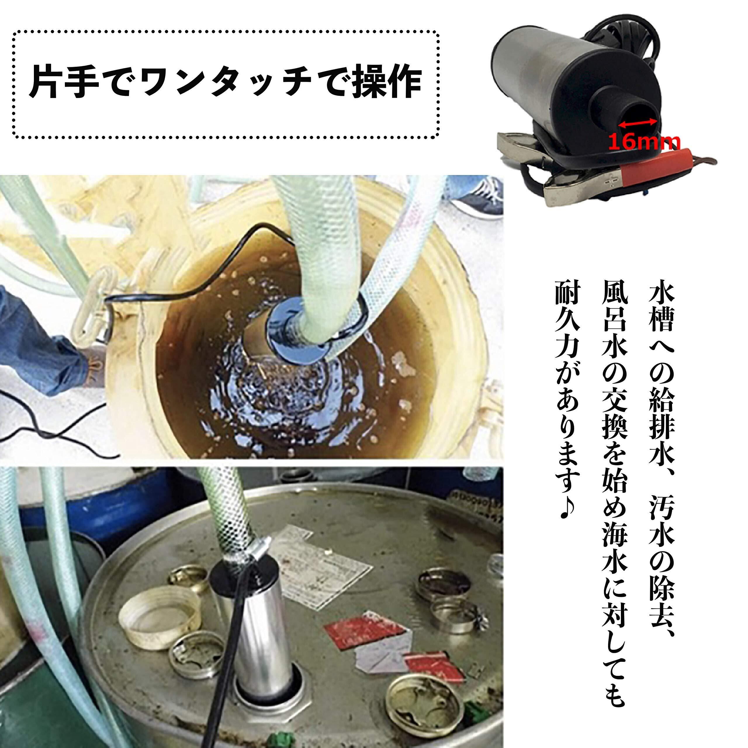 サイズ(約): 全長175mm x 直径50mm、出口直径(約): 17mm、規格: DC12V 6.4A、最大流量: 33L/min、最大揚程: 2m-3m、連続使用時間(約): 20分以内