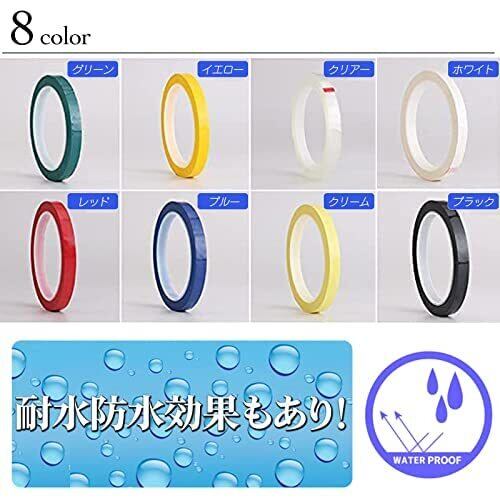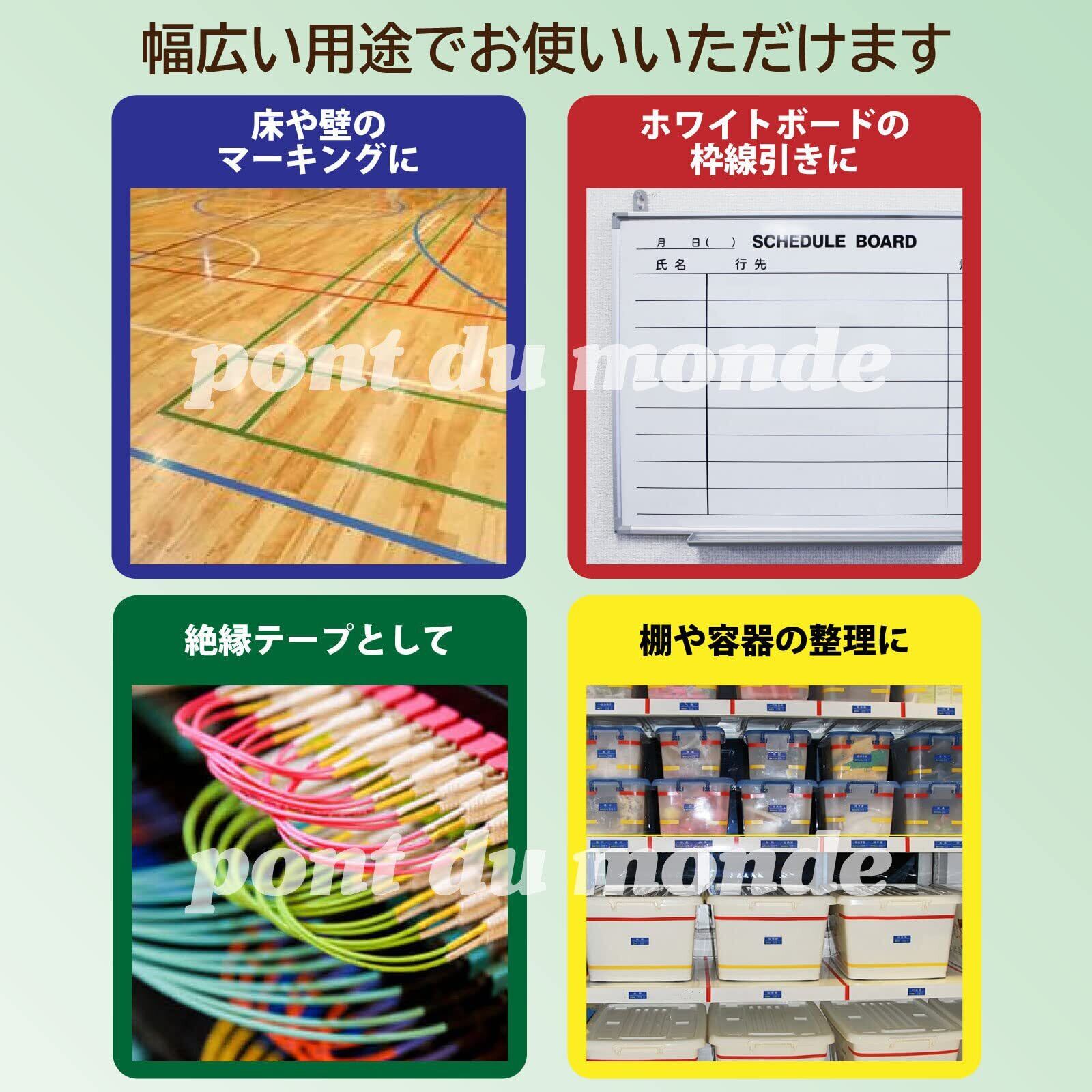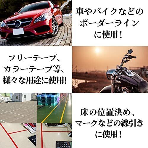 耐水防水効果もあり、車やバイクなどのボーダーラインや、床の位置決め、マークなどの線引きテープ、フリーテープ、カラーテープ等、様々な用途にお使いいただけます。