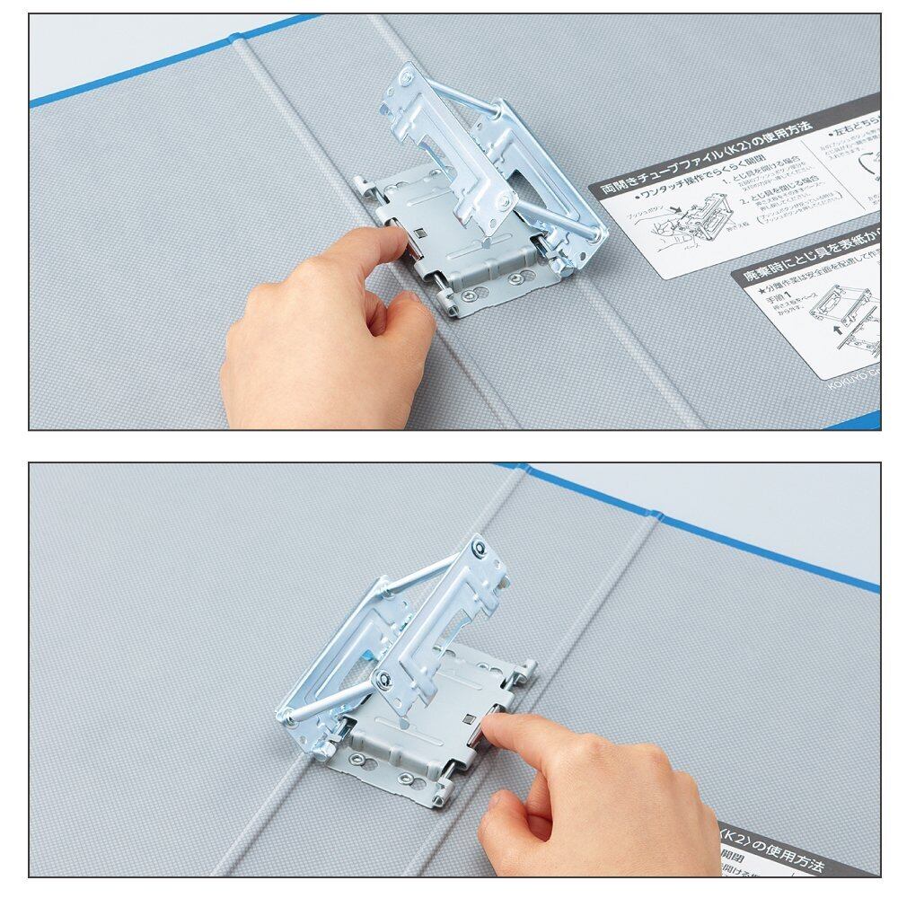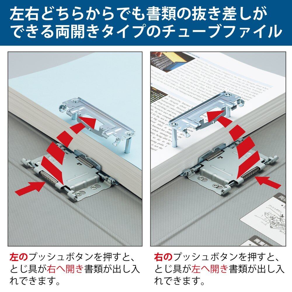 ●左右どちらからでも抜き差しできる両開きタイプのチューブファイルなので、書類を表裏どちらからでも入れ替えることができ、整理しやすく便利です。