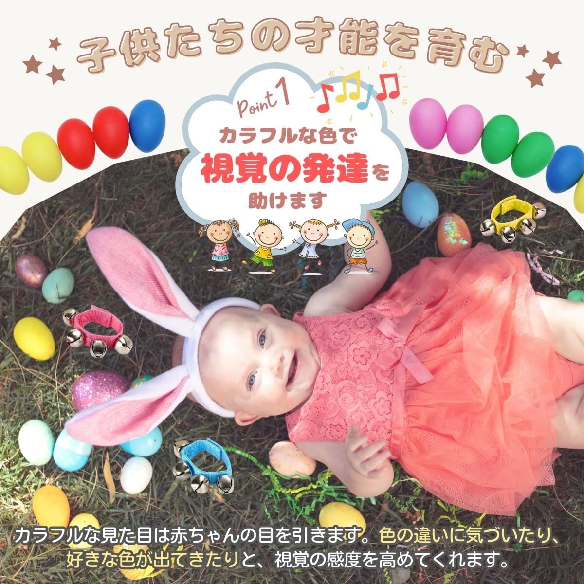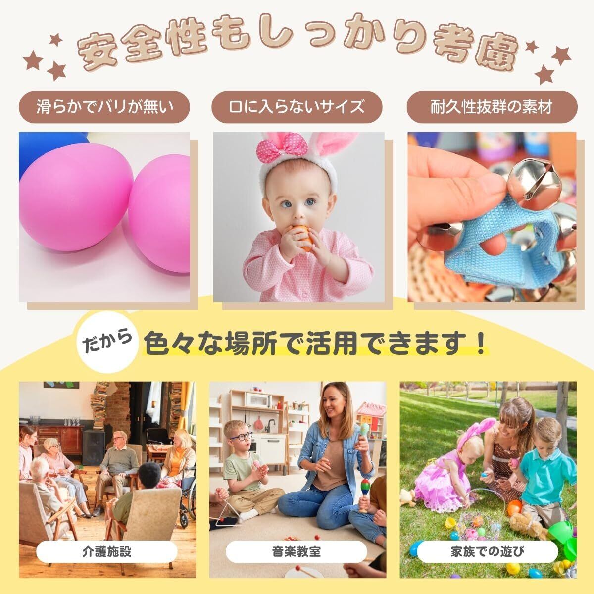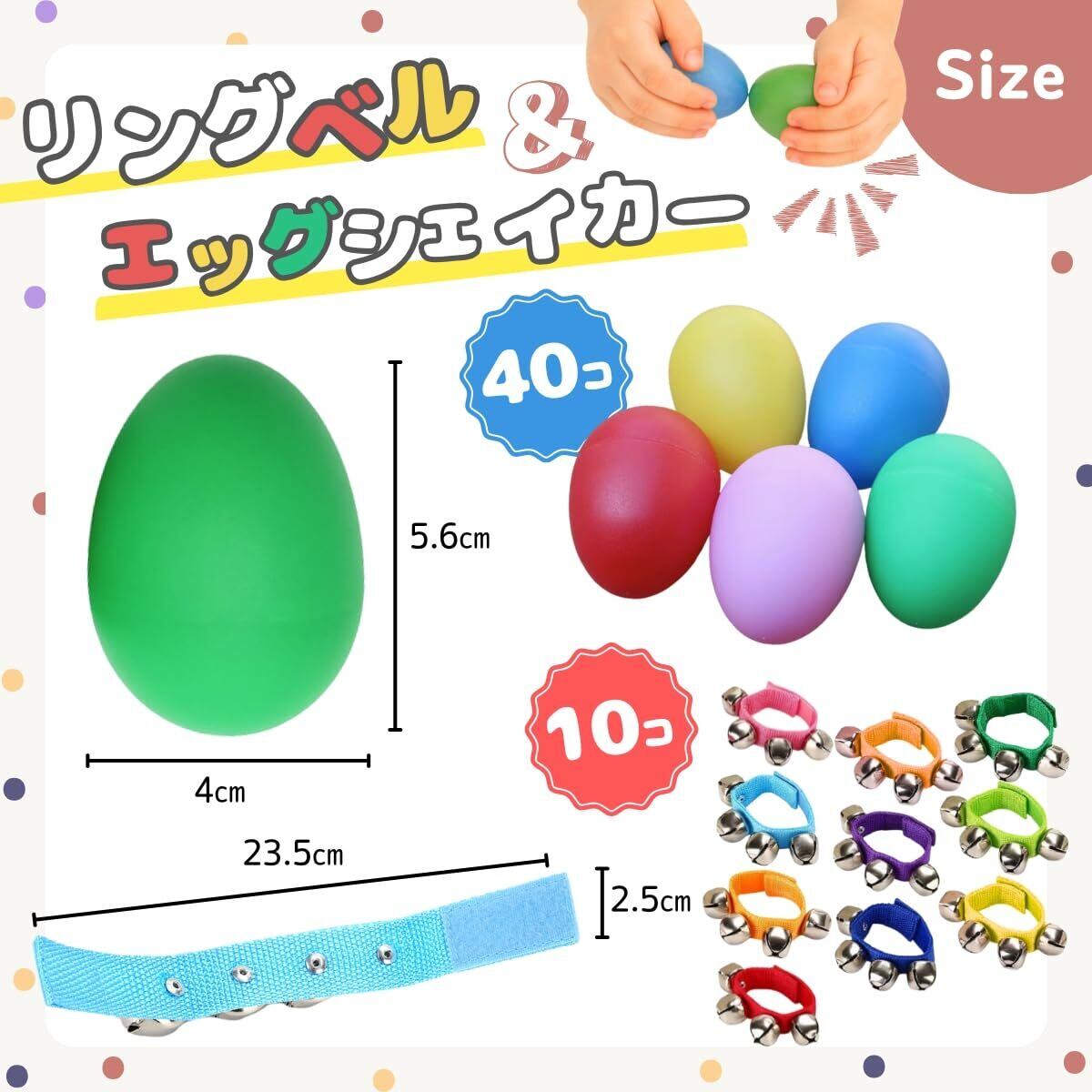 【カラフルで楽しい!自由にコーディネート可能なセット】 鮮やかな色が揃っており、お好みに合わせて自由にコーディネートできます。カラフルな楽器は、パーティーやカラオケ、クリスマスなどのイベントシーンを一層盛り上げます。【セット内容】エッグシェイカー(5色)40個、リングベル(10色)10個【サイズ】エッグシェイカー:約5.6㎝×4㎝、リングベルベルト:約23.5㎝×2.5㎝※対象年齢6歳以上
