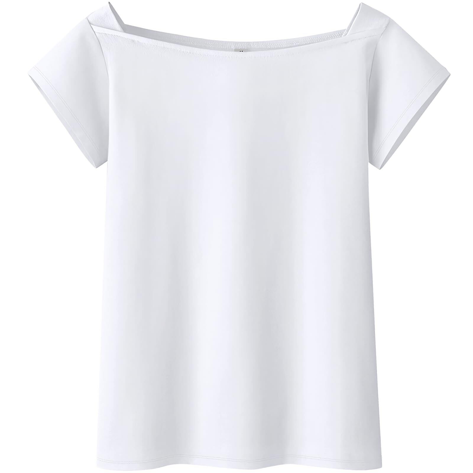 とっても使えるキレイめTシャツ。開きすぎないボートネックのデザインが、デコルテをすっきりと見せます。