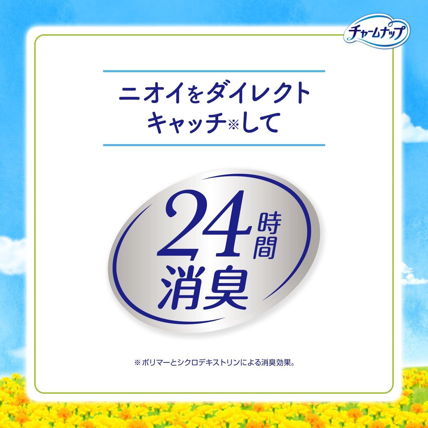 気になるニオイをダイレクトキャッチ※1して24時間ずっと消臭。 ※1ポリマーとシクロデキストリンによる消臭効果。